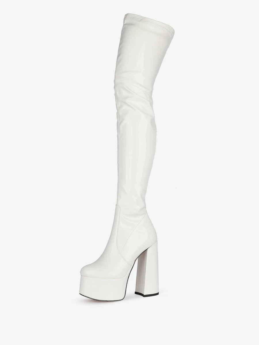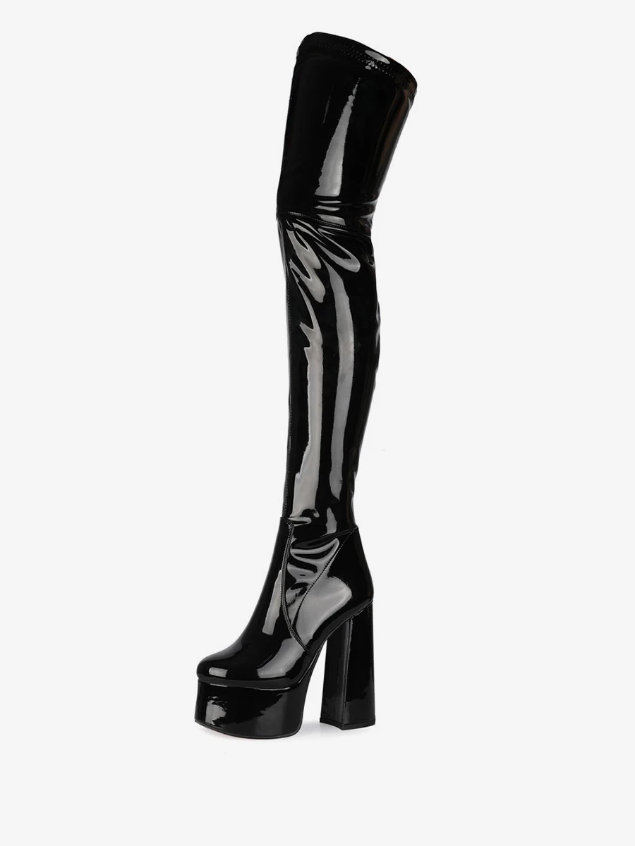 Over The Knee Boots Black Round Toe Chunky Heel High Heel Platform Bright Leather Winter Boots For Women