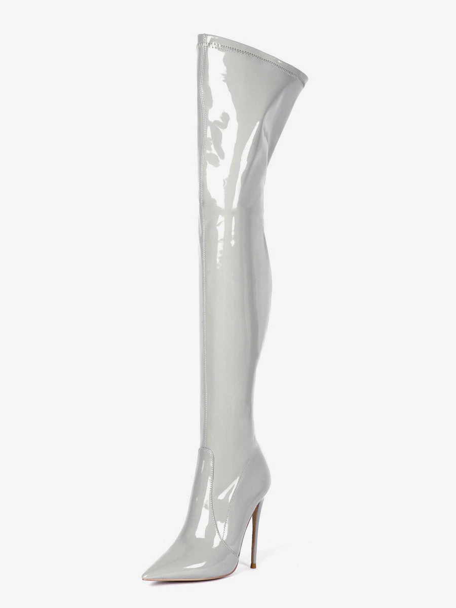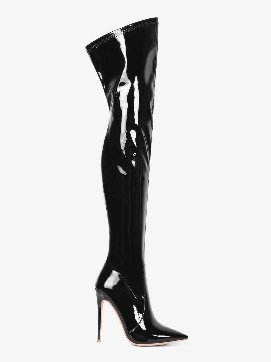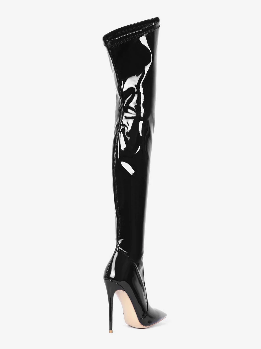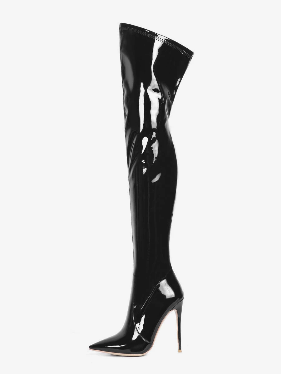 Over The Knee Boots Leather Black Pointed Toe Stiletto Heel Bright Leather Thigh High Boots