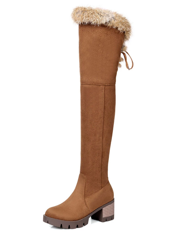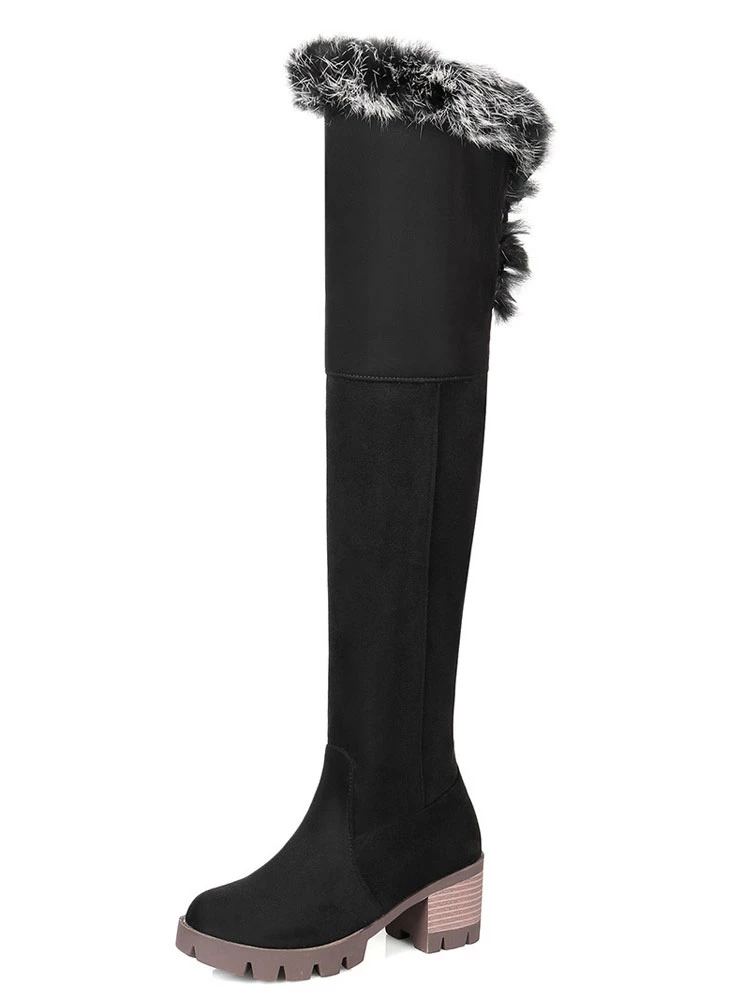 Over The Knee Boots Womens Micro Suede Faux Fur Round Toe Chunky Heel Thigh High Boots