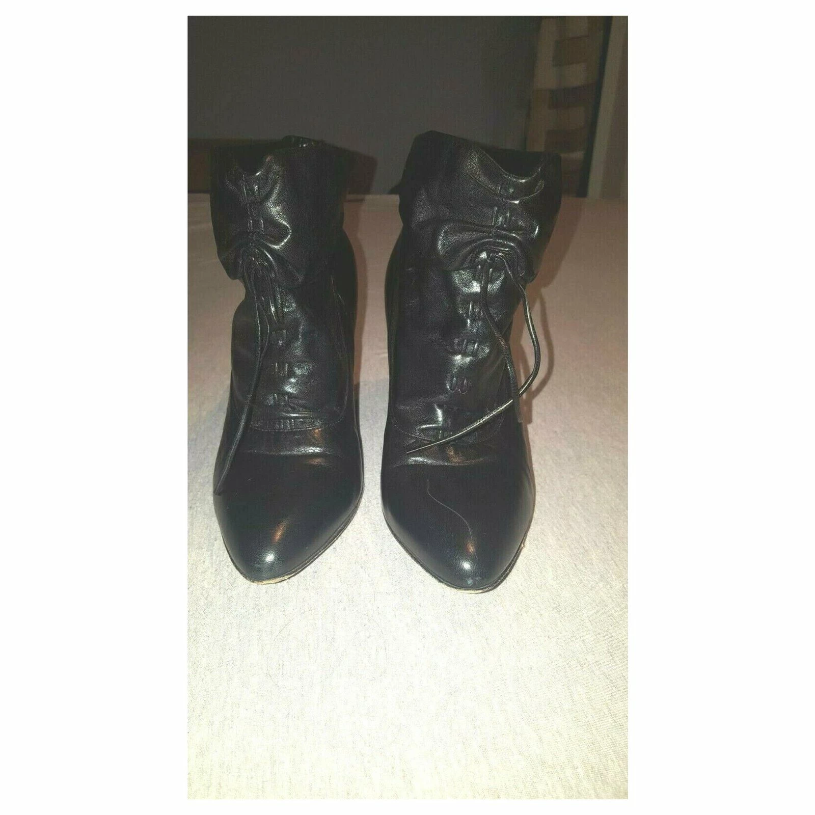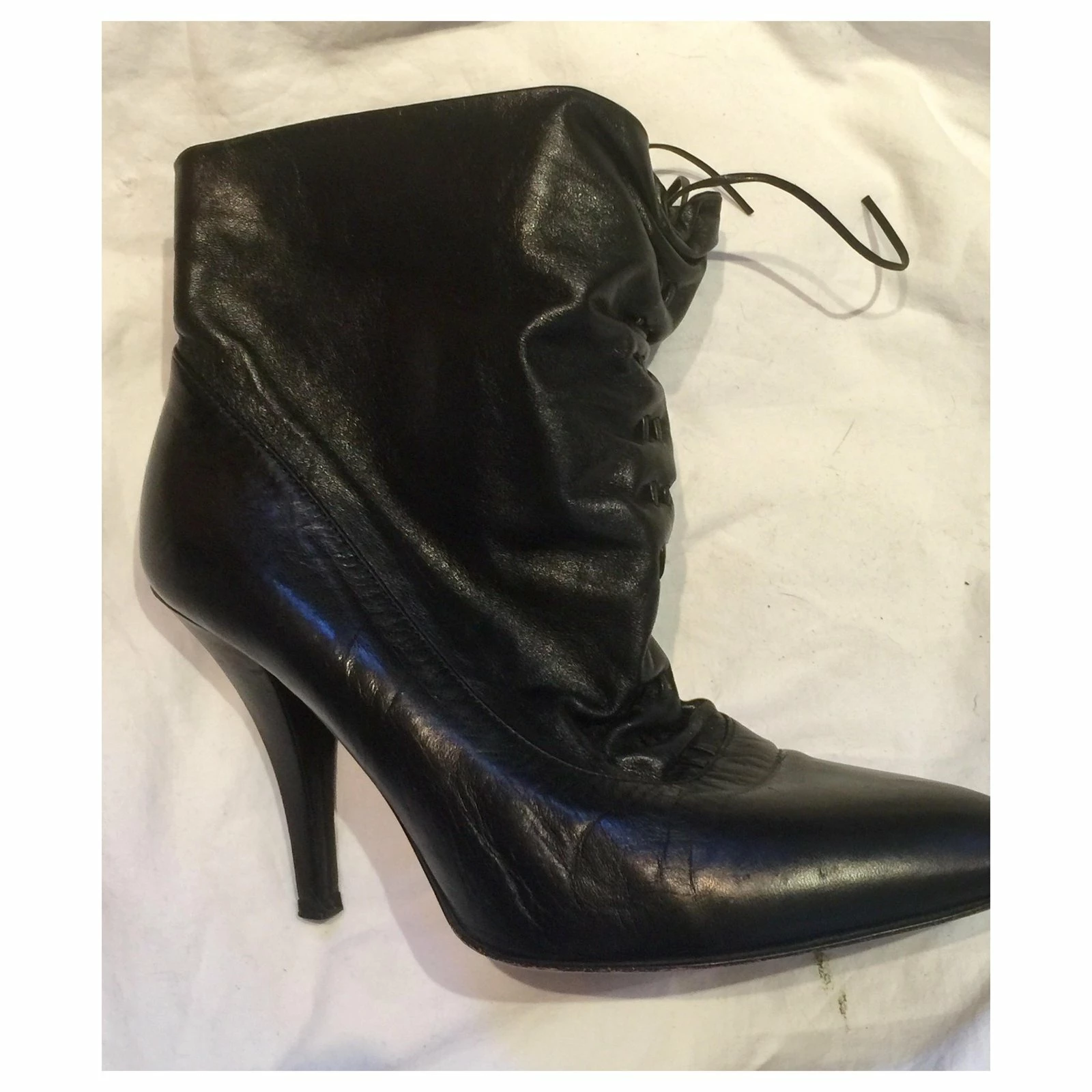 Stunning black leather ankle boots with a ruchet front, rucheting can be adjusted with 2 leather draw strings, the boot leg can be worn up or down, semi pointed almond toe. Some minimal signs of wear (light creasing that is gone when the shoe is worn and some minimal surface scuffs, also not visible when worn but would disappear with polish)