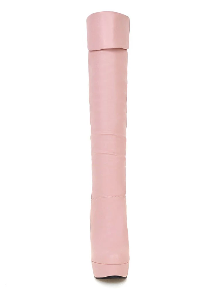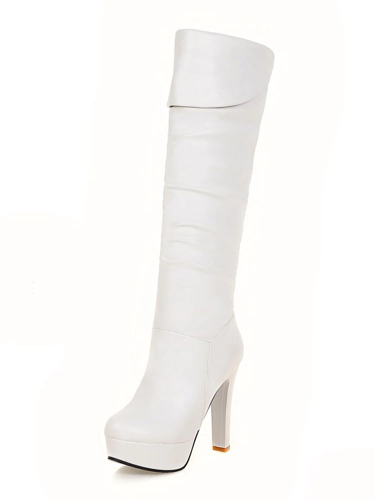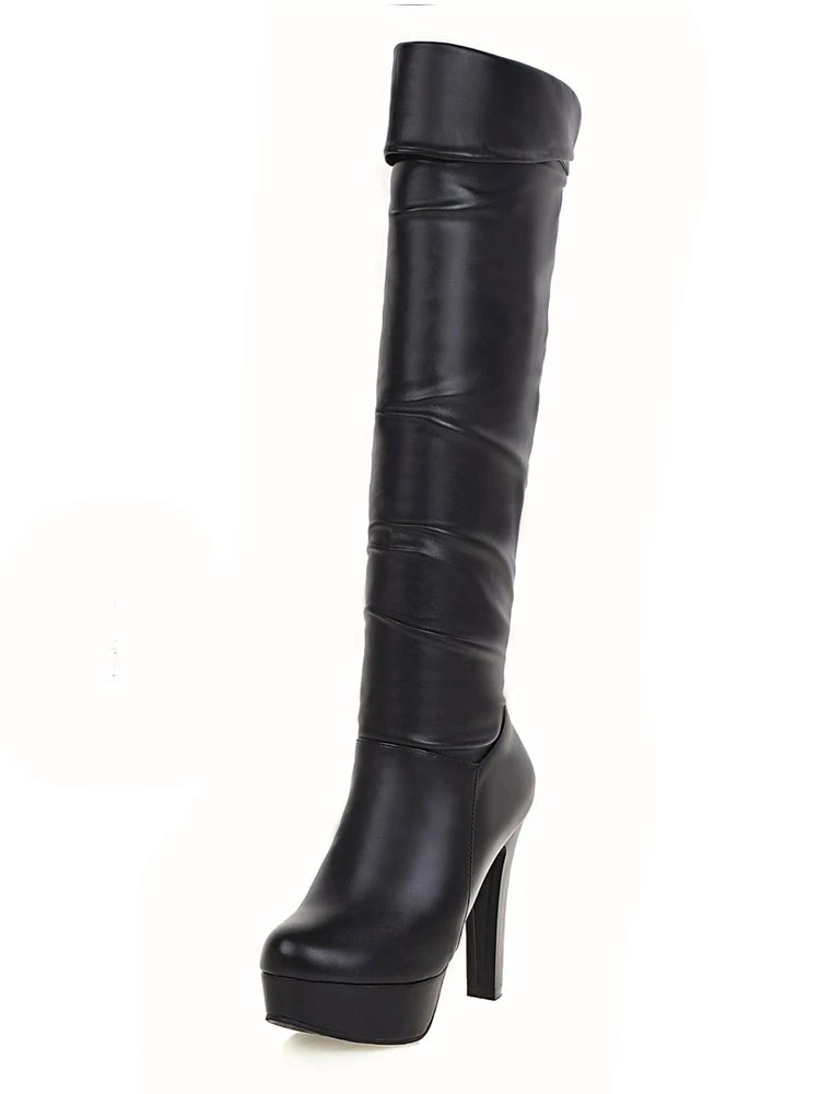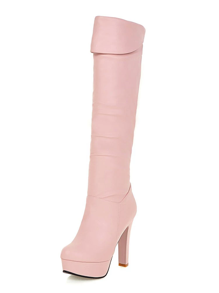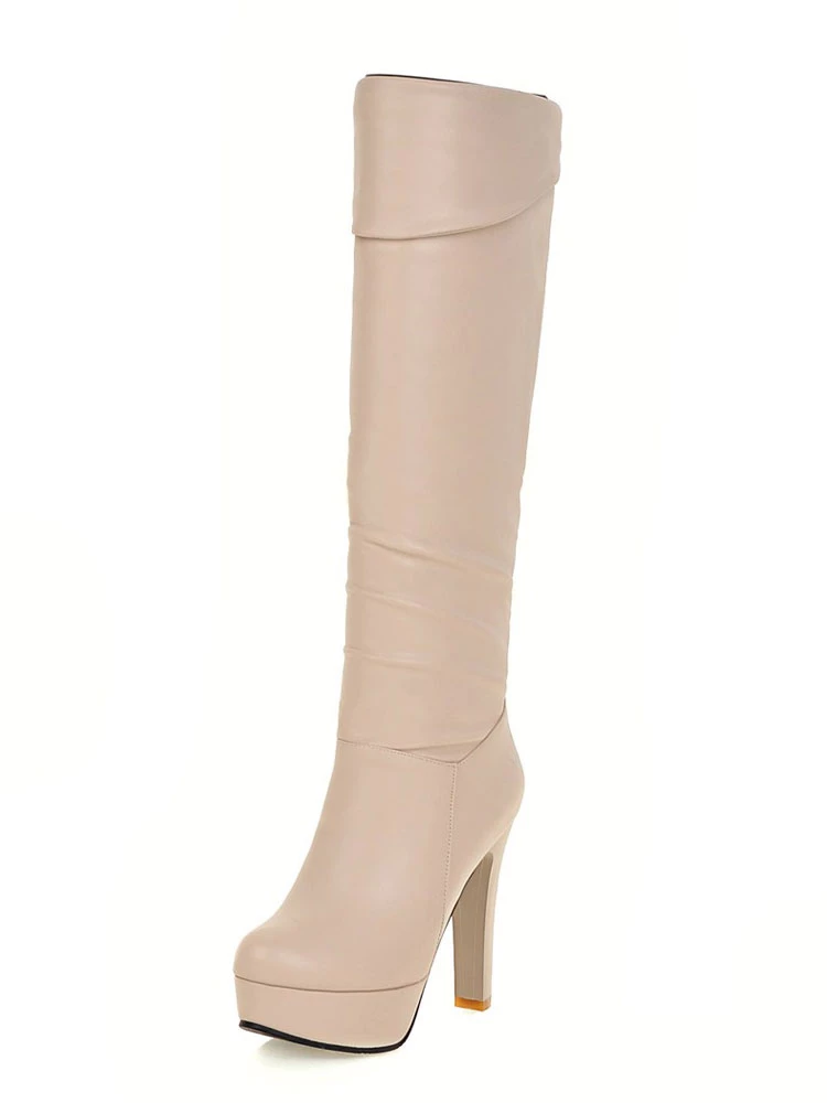 Platform Knee High Boots Womens Almond Toe Chunky Bright Leather Heel Boots