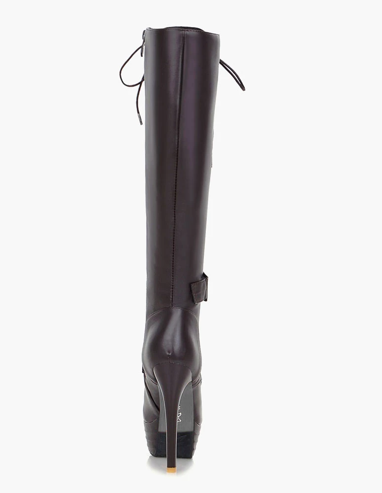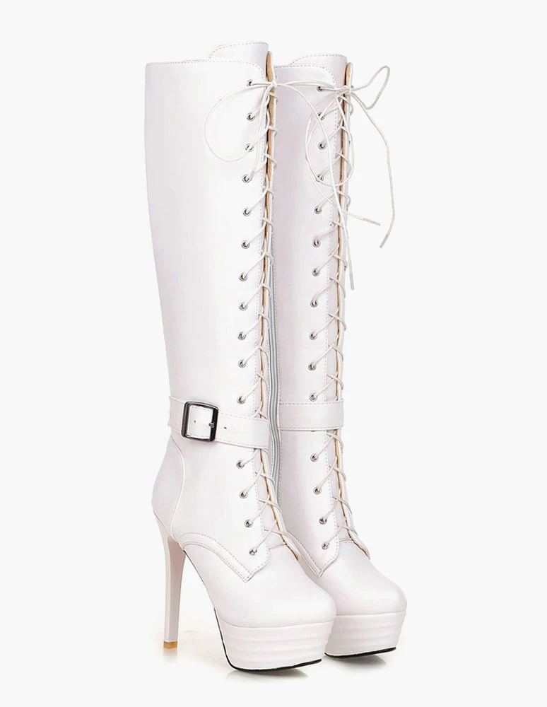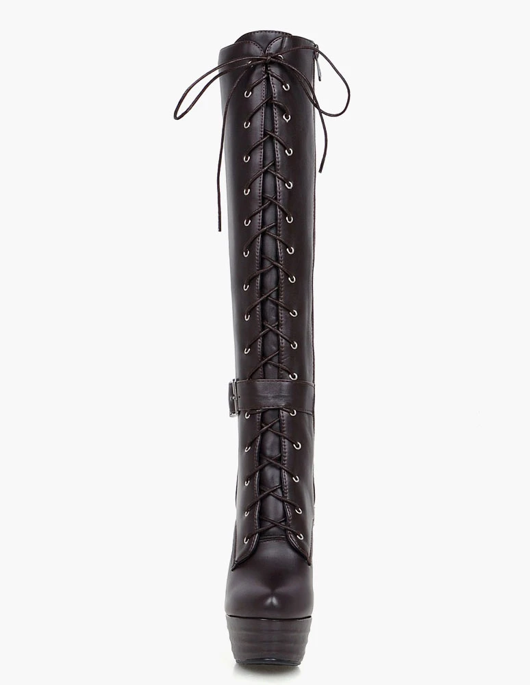 Platform Knee High Boots Womens Patent Lace Up Round Toe Stiletto Heel Winter Boots