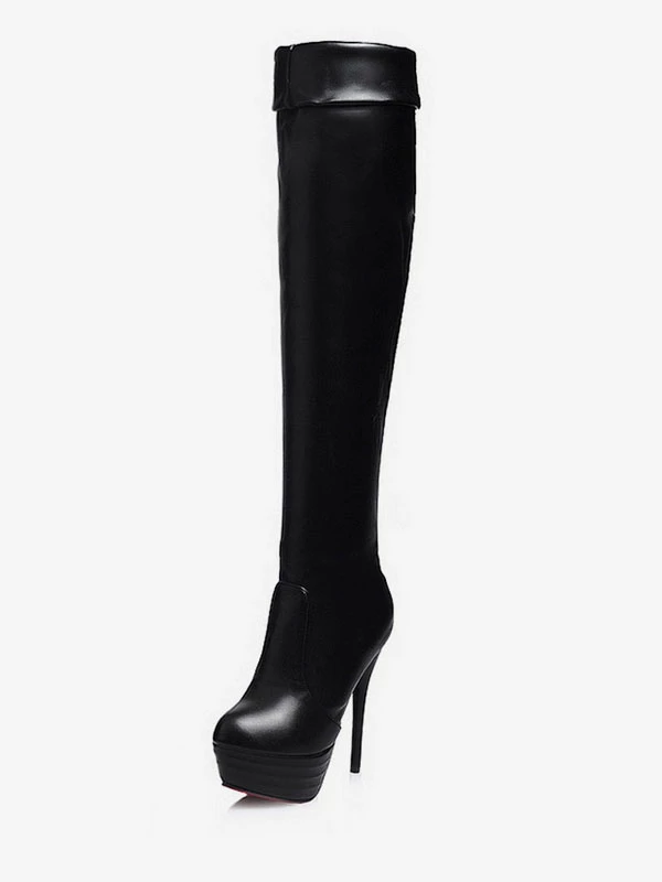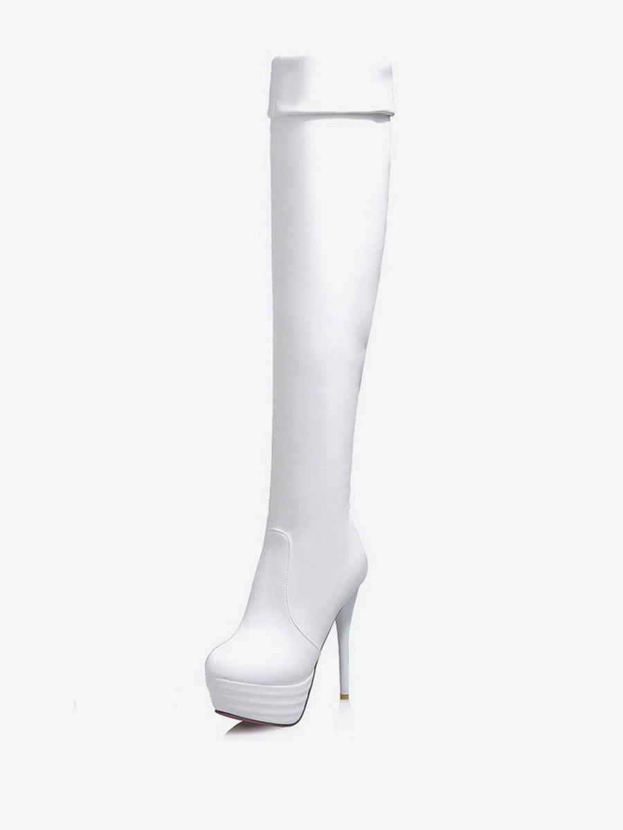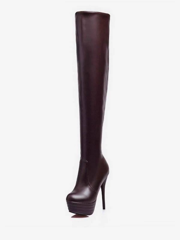 Platform Thigh High Boots Womens Solid Color Bright Leather Round Toe Stiletto Heel Boots