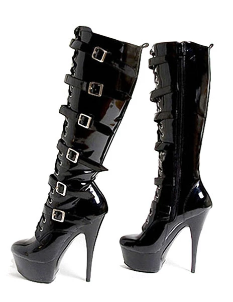 Pole Dance Shoes Platform High Heel Boots Women’s Knee Length Club Sexy Shoes Buckle Punk Pole Dancing Patent Heel Boots Stripper Shoes