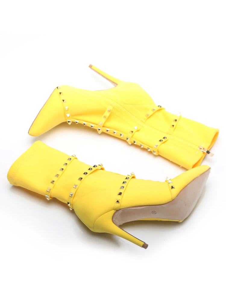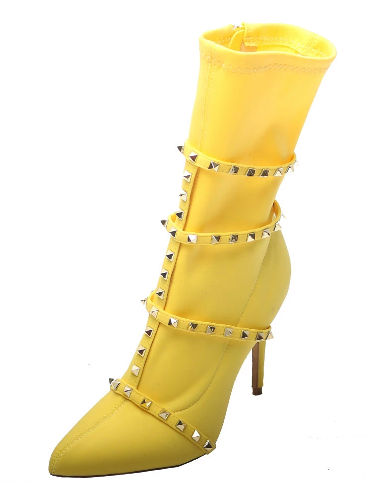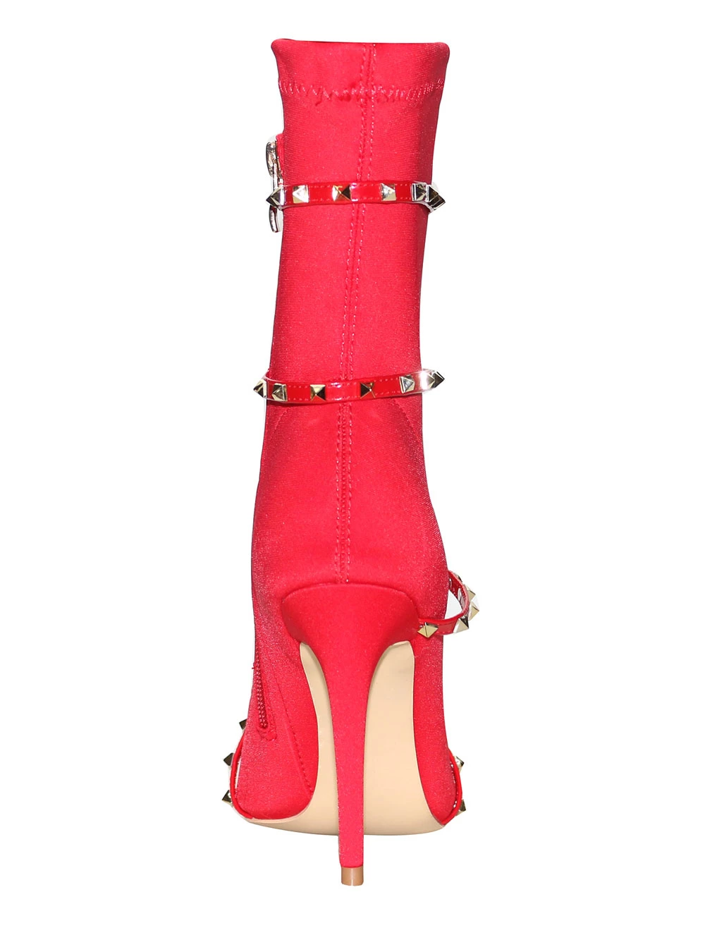 Red Ankle Boots High Heel Booties Pointed Toe Rivets Strappy Stretch Boots