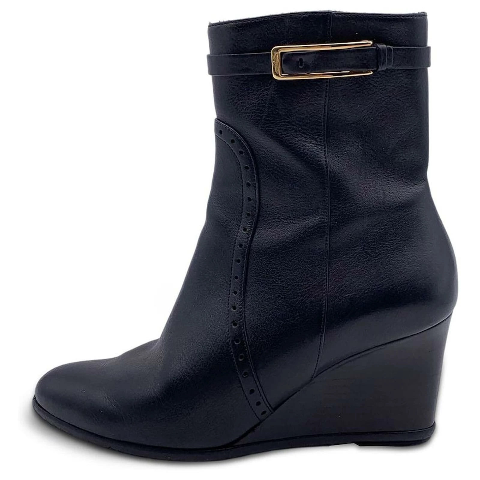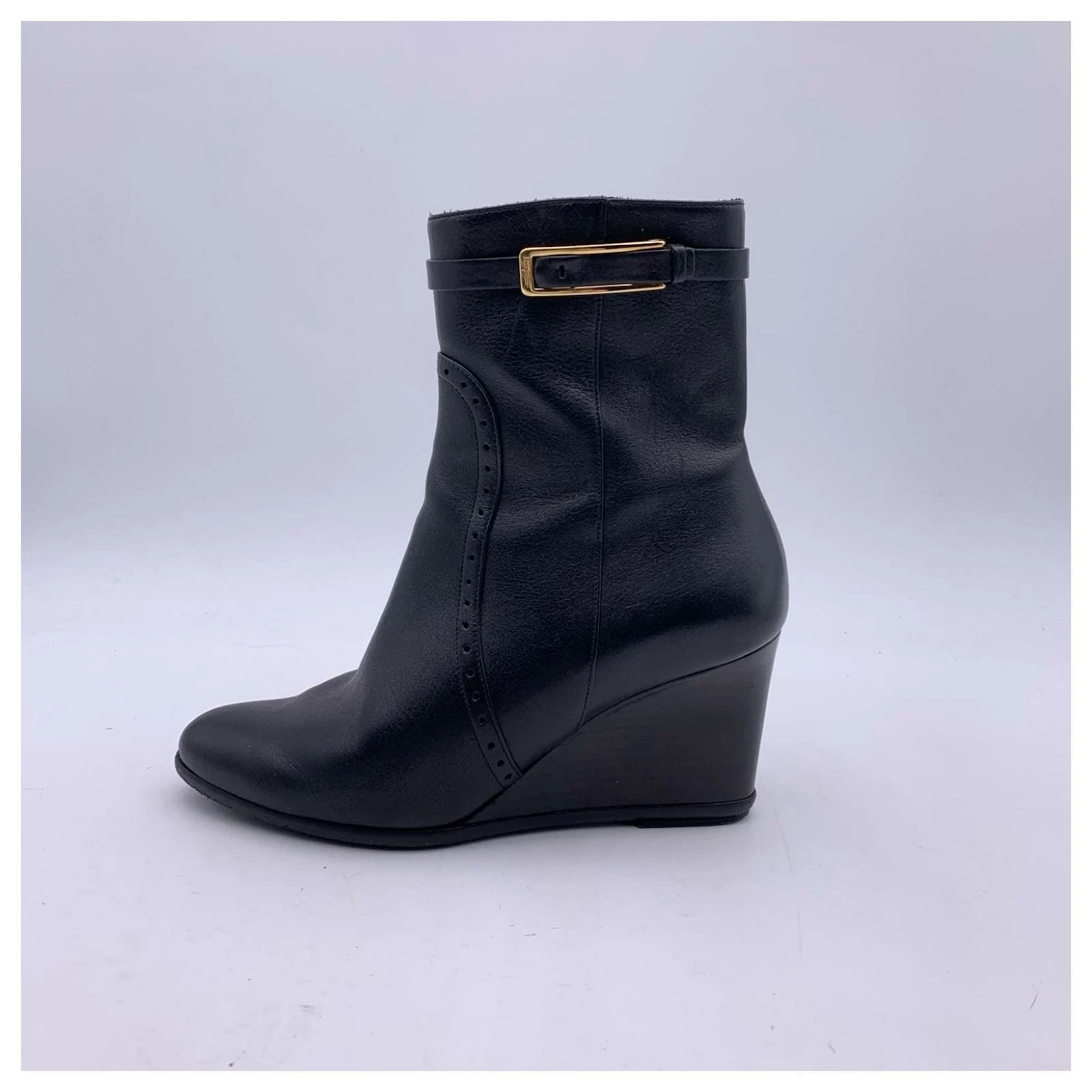 Salvatore Ferragamo black leather heeled ankle boots with wedges. Composition: leather. zip closure on the side. Almond toeline. Gold metal buckle detail. leather outsole. Heels height: 3 Inches – 7.6 cm . Size 6.5 C – 37 C Details MATERIAL: Leather COLOR: Black MODEL: – GENDER: Women COUNTRY OF MANUFACTURE: Italy STYLE: Bootie PATTERN: Solid dustbag? NO, we will provide an organic cotton dustbag BOX? No HEEL HEIGHT: High (3-3.9 IN) SHOE SHAFT STYLE: EUR Shoe Size: EUR 37 Condition B – VERY GOOD Gently used. Some normal wear of use on leather. some wear of use on the outsoles. Please check the photos carefully and ask if you need to know more details or if you have any doubts.
