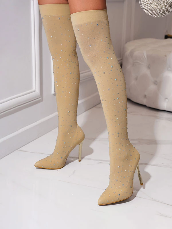 Sexy High Heel Boots Pointed Toe Rhinestones Street Wear Black Thigh High Boots Over The Knee Boots