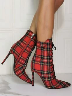 Women Ankle Boots Red Canvas Pointed Toe Stiletto Heel Sky High Houndstooth Booties