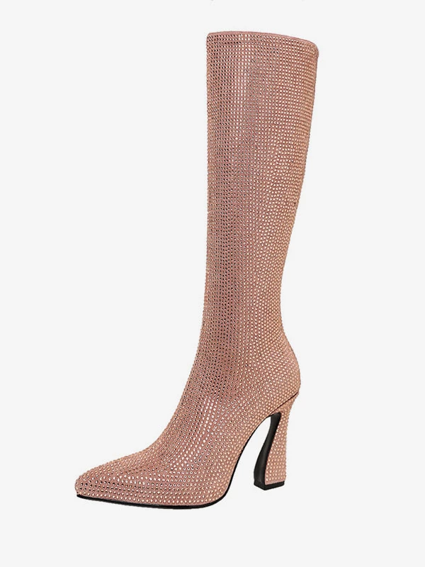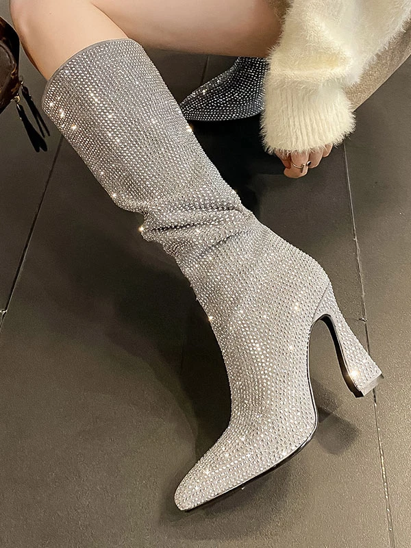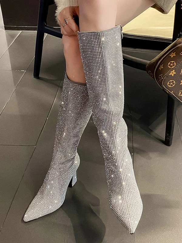 Silver Knee High Boots Women Rhinestones Pointed Toe Spool Heel Party Boots