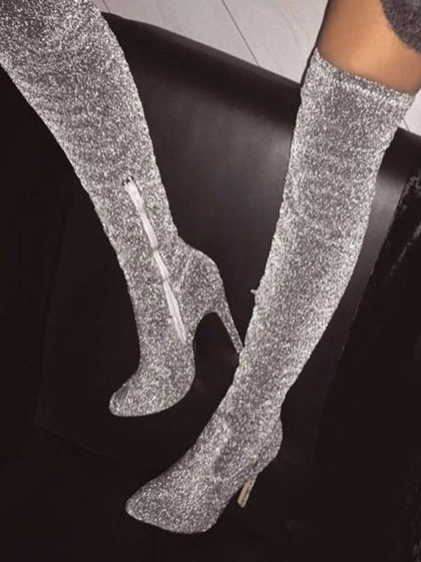 Thigh High Boots Womens Silver Sequined Cloth Pointed Toe Stiletto Heel Over The Knee Boots