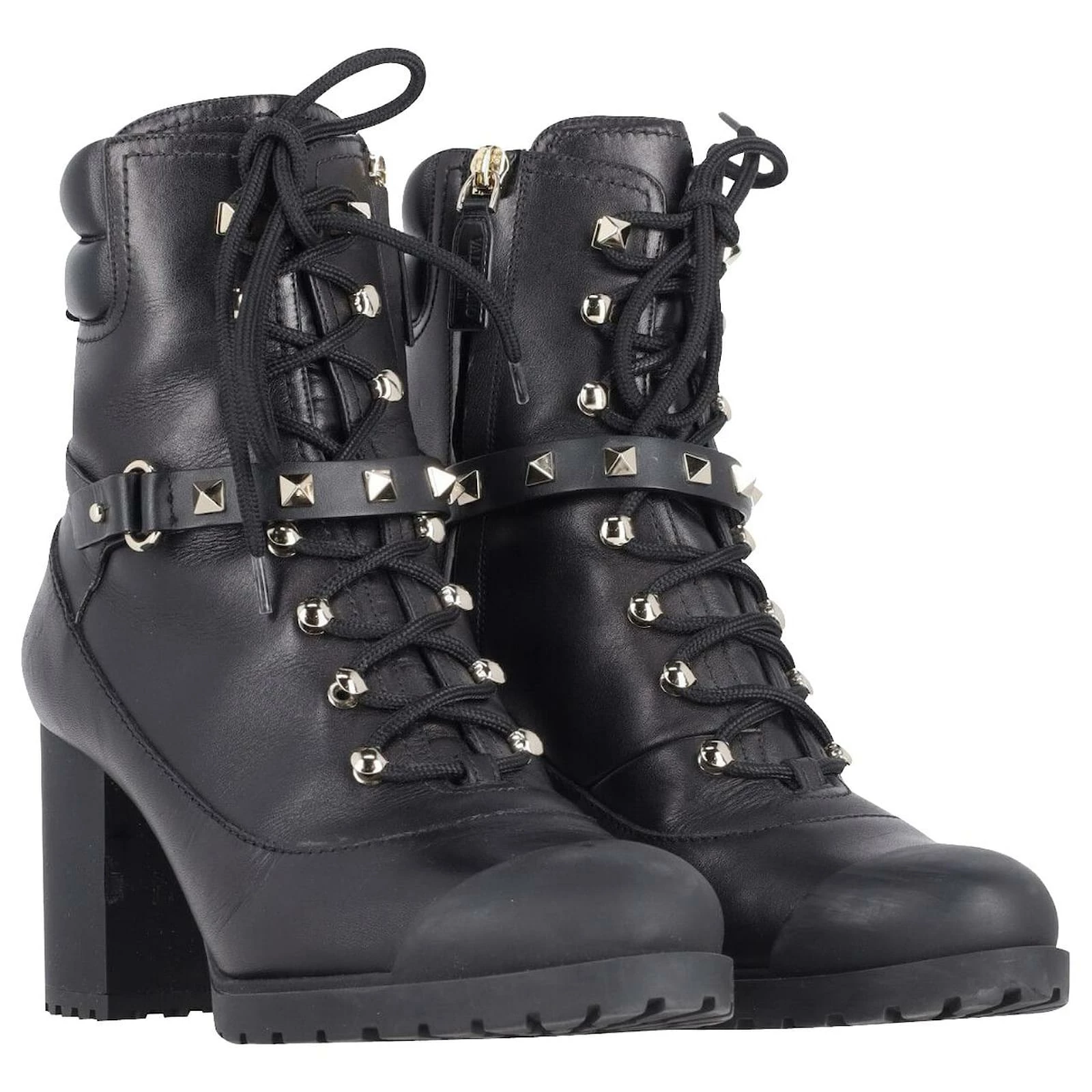 Valentino Garavani ticks the hiking-boot trend with this ‘Rockstud’ pair. They’ve been made in Italy from leather in a black colorway. They have 95mm heels and cleated rubber soles – note the row of galvanized ‘Rockstuds’ tracing the leather straps.