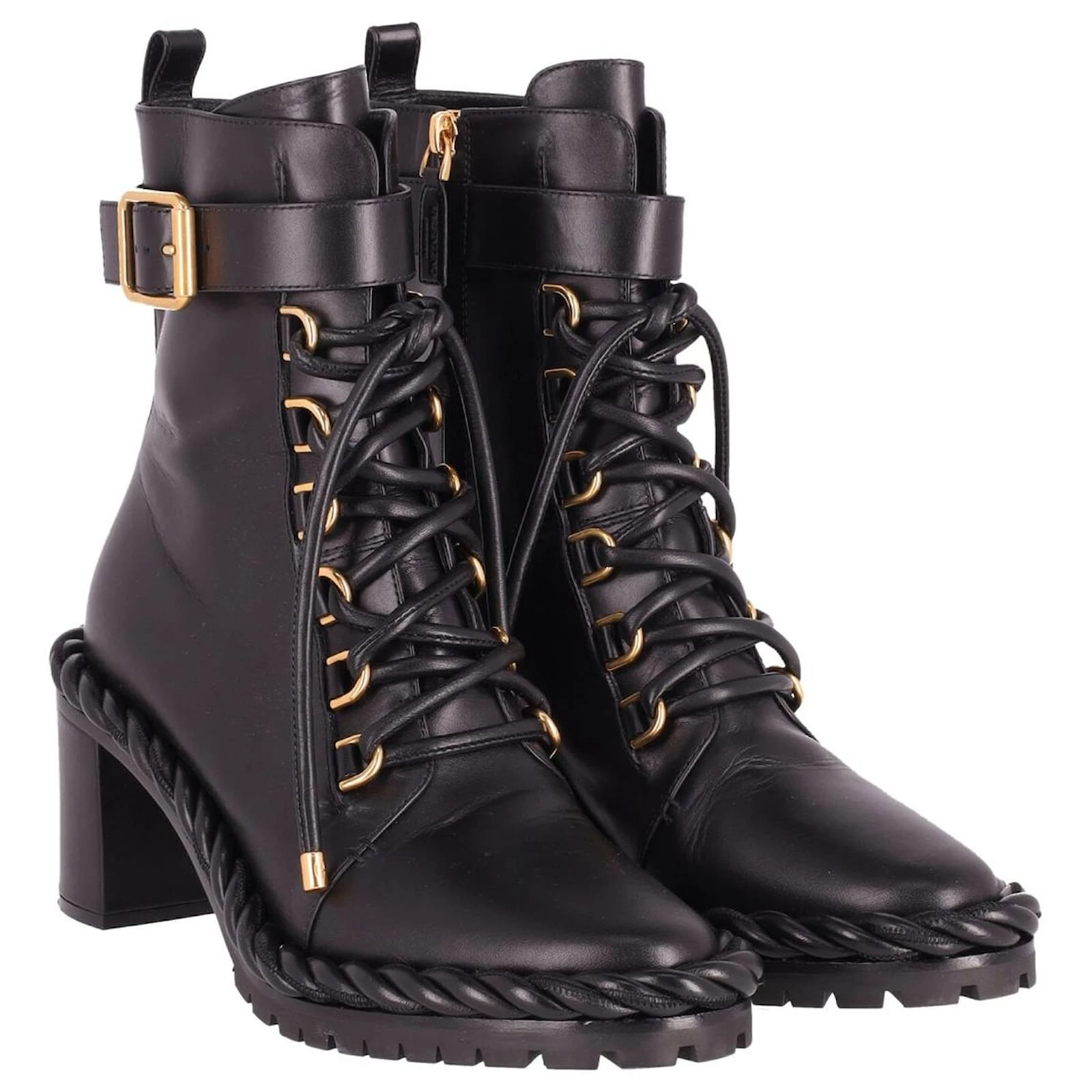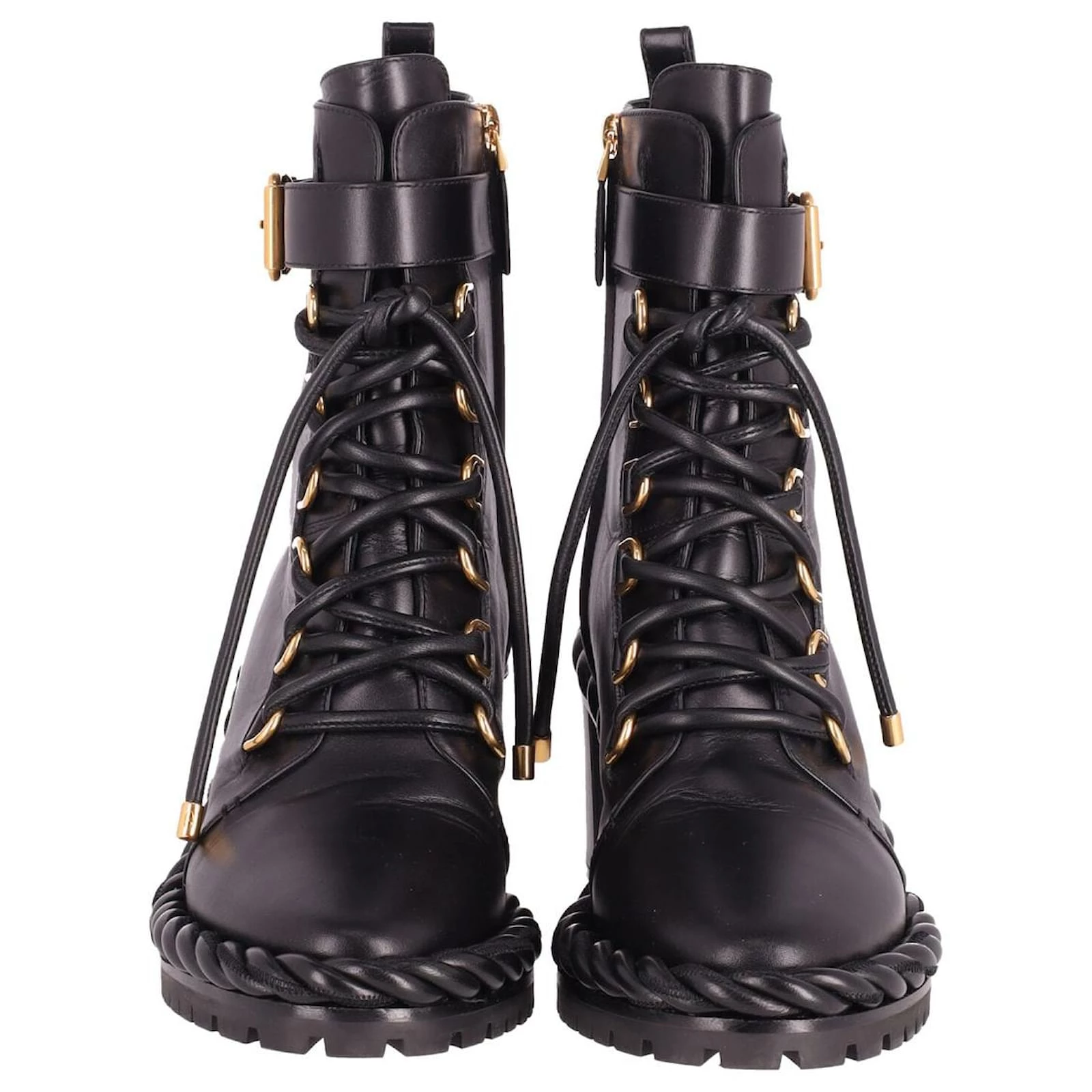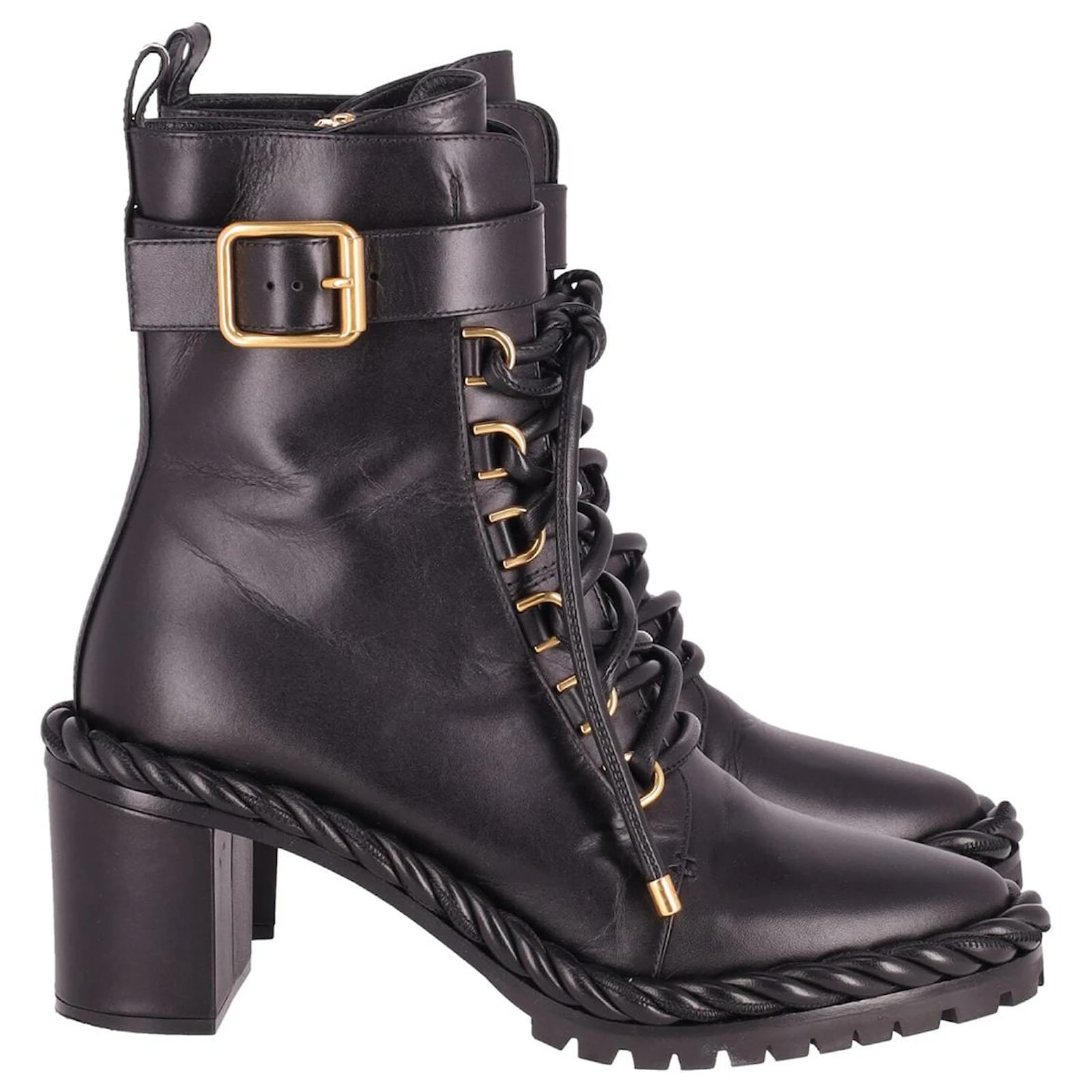 Stay ahead in the fashion game with these Valentino The Rope combat boots. Constructed from leather, the rope trims, gold-tone hardware, and buckles add an extra dose of style to the creation. Pair it up with black leather pants or a skirt for a chic look.