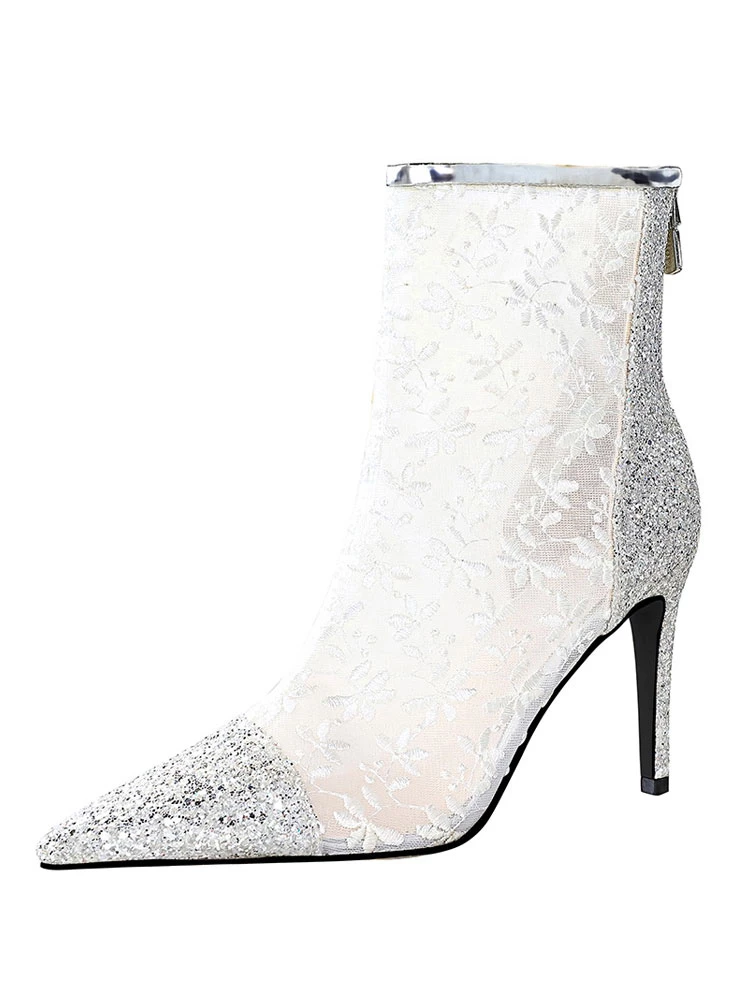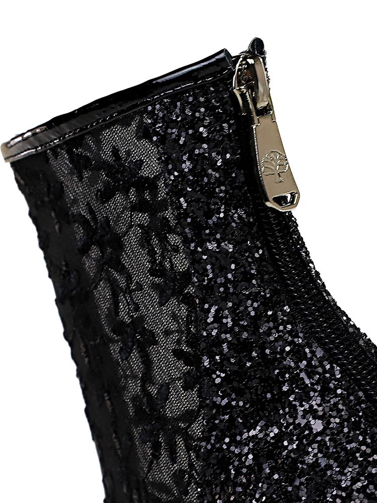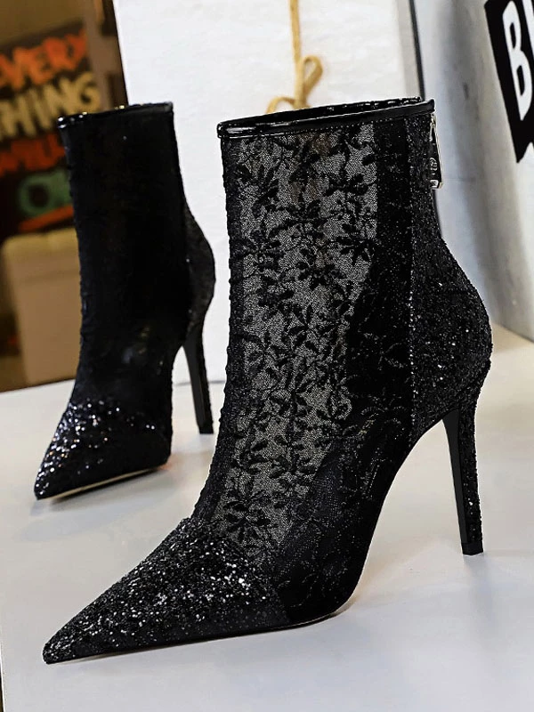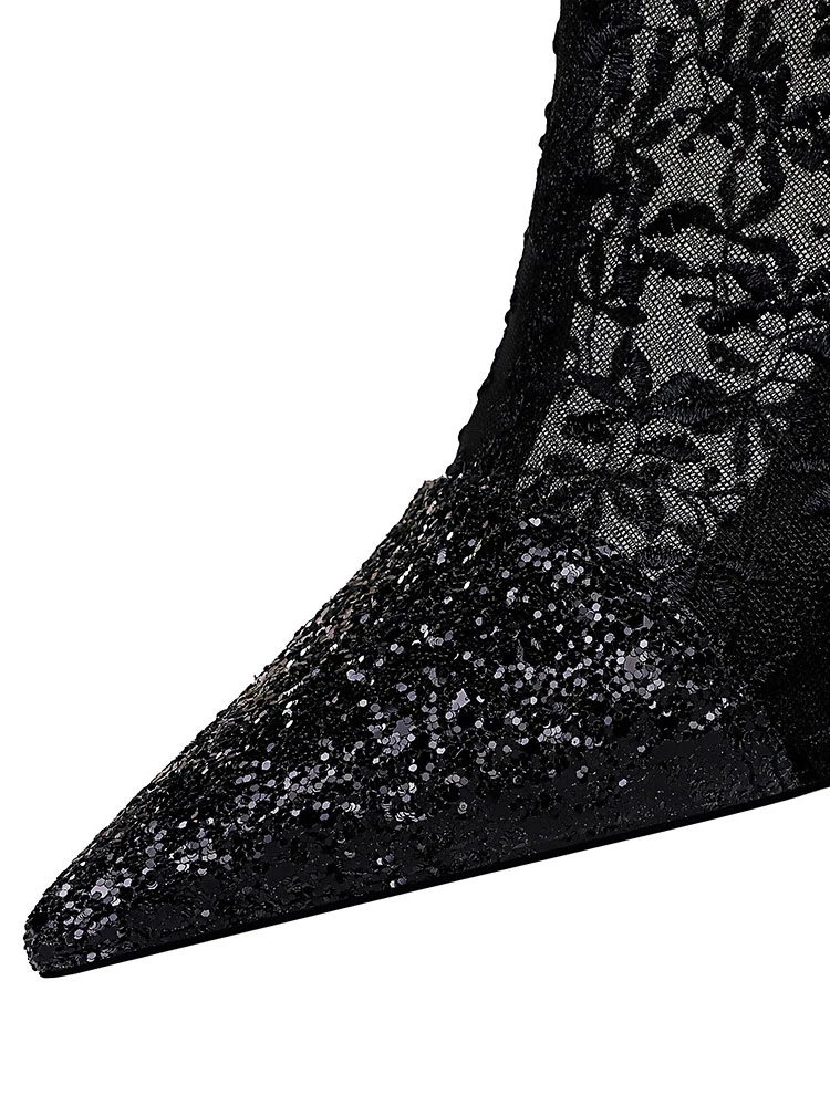 Women Ankle Boots Black Lace Pointed Toe Sequins Stiletto Heel High Heel Booties