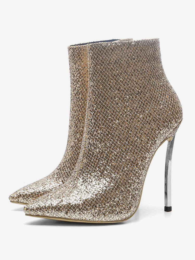 Women Ankle Boots Light Gold Sequined Pointed Toe Stiletto Heel High Heel Booties