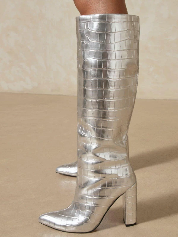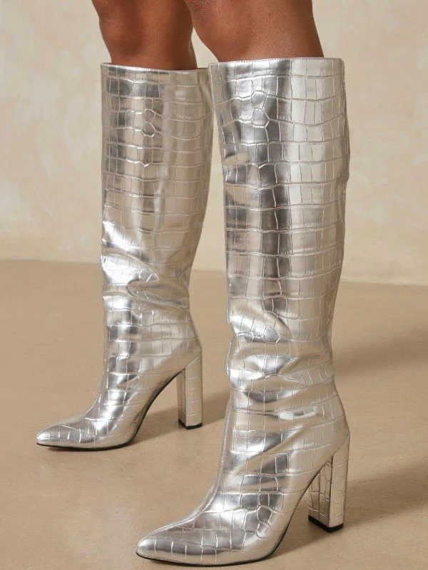 Women Booties Pointed Toe Chunky Heel PU Leather Blond Knee-High Boots