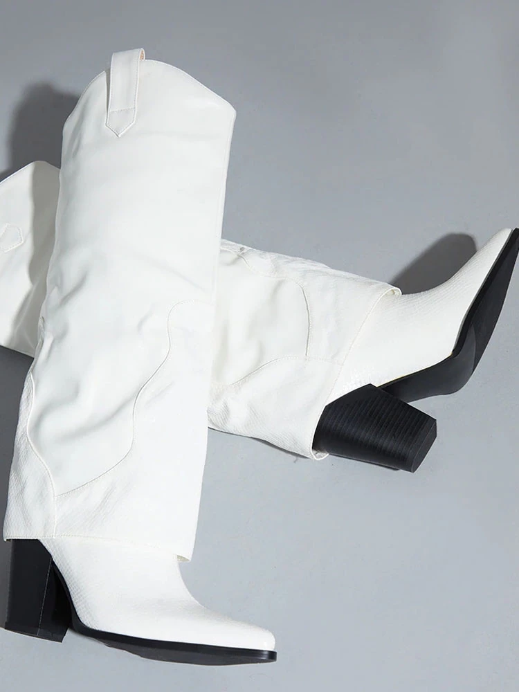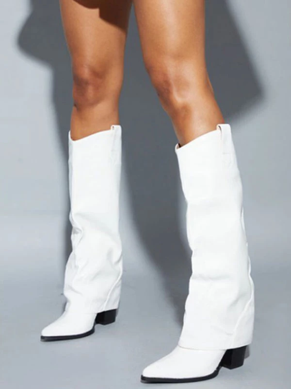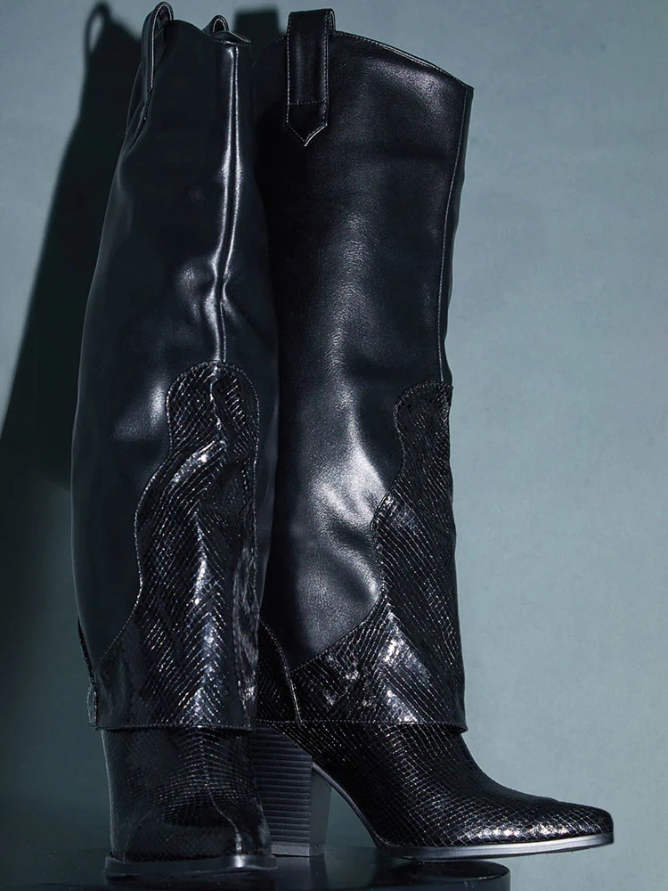 Women Boots Pointed Toe Chunky Heel PU Leather Black Knee-High Boots