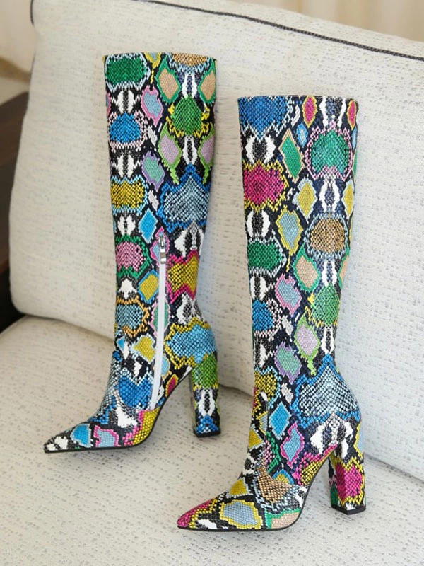 Women Boots Pointed Toe Chunky Heel PU Leather Green Knee High Boots