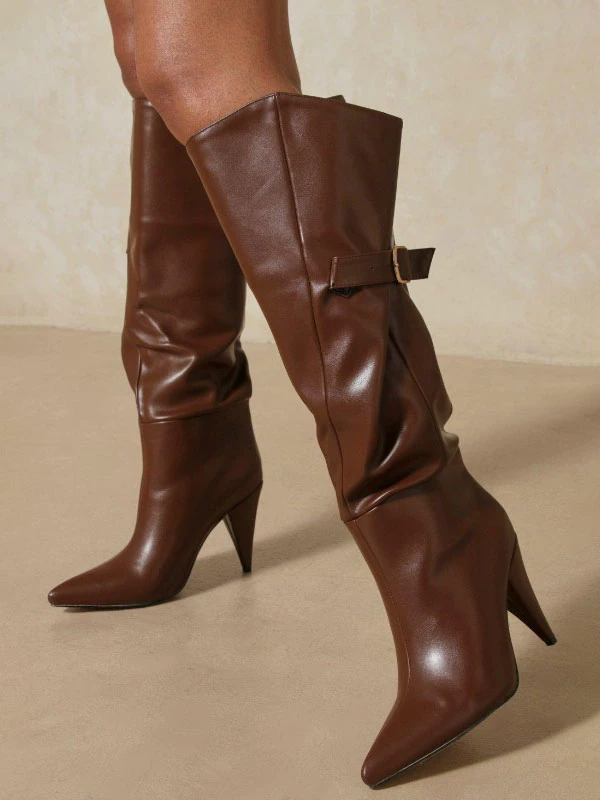 Women Boots Stiletto Heel Pointed Toe PU Leather Chocolate Brown Knee-High Boots