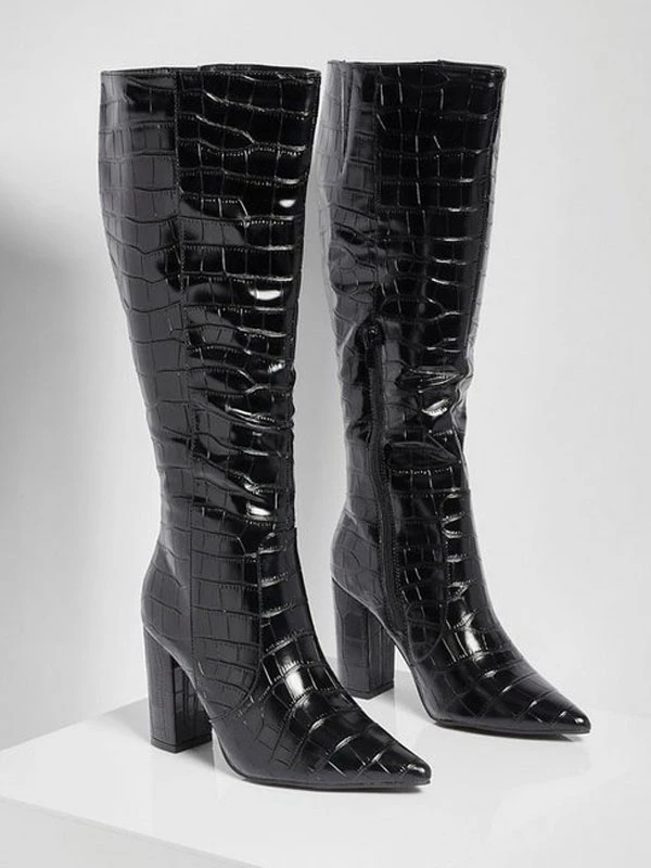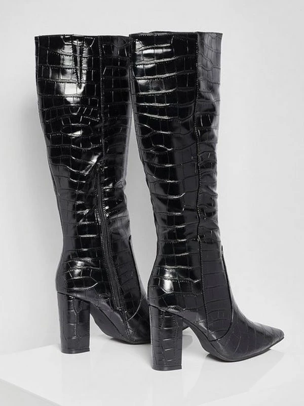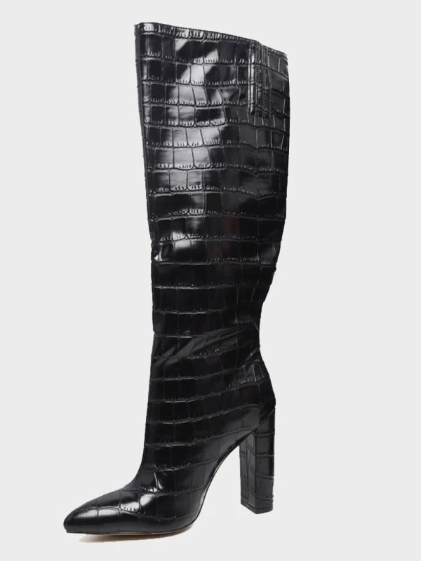 Women Knee High Boots Leather Black Round Toe Stone Patter Chunky Heel Boots