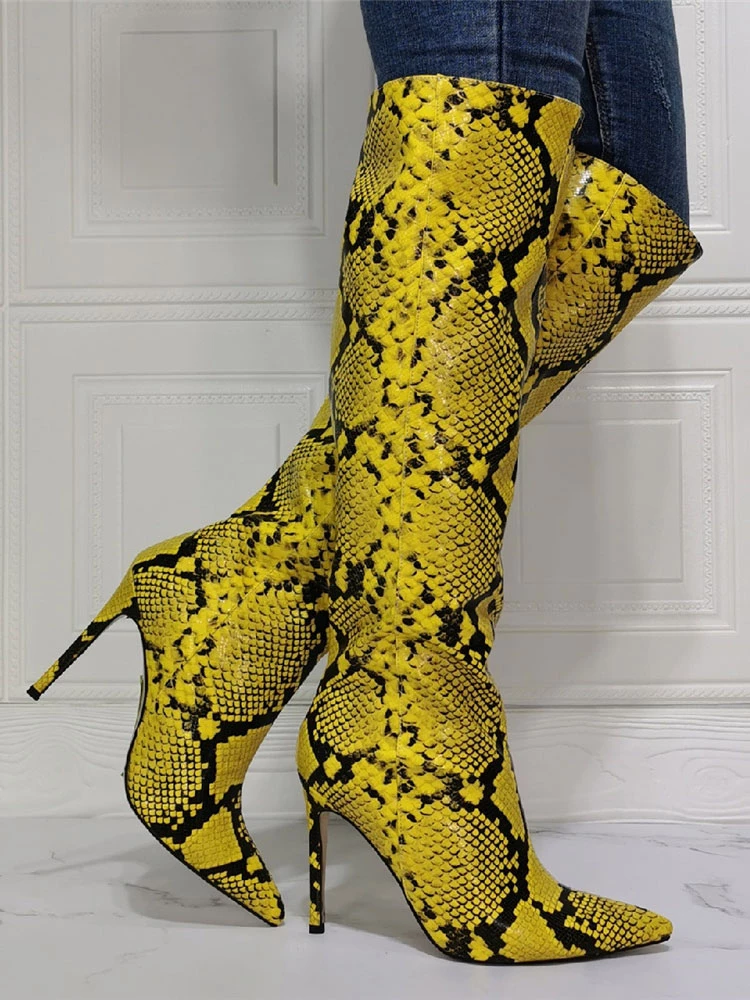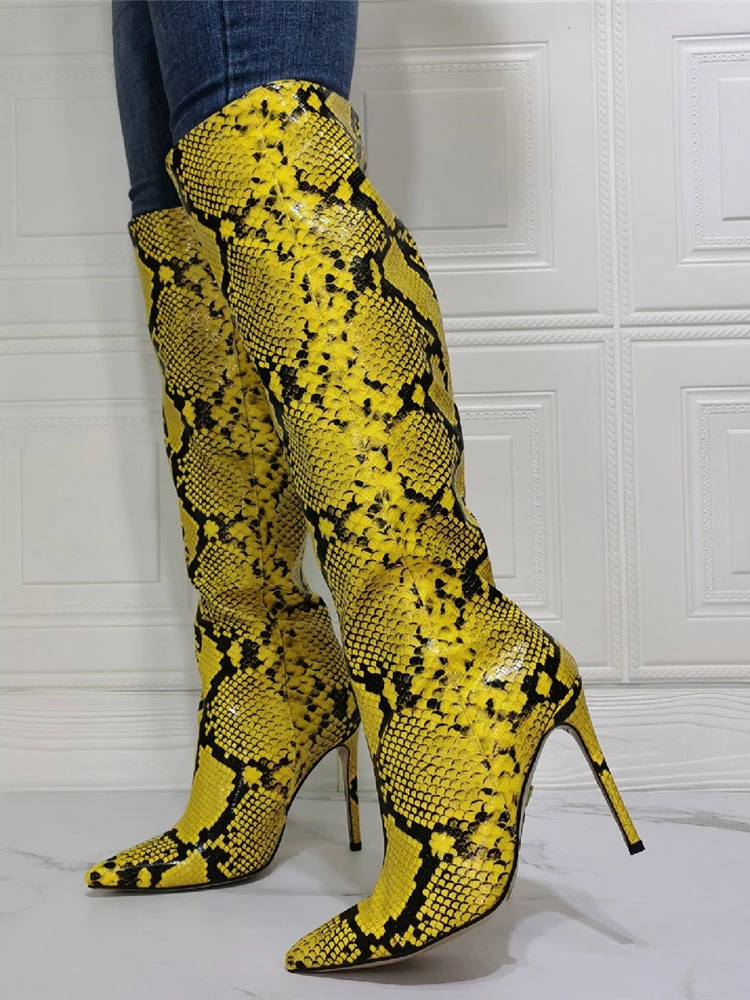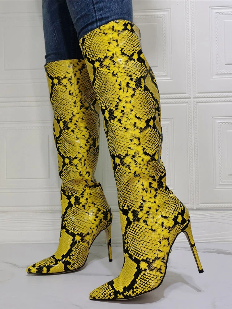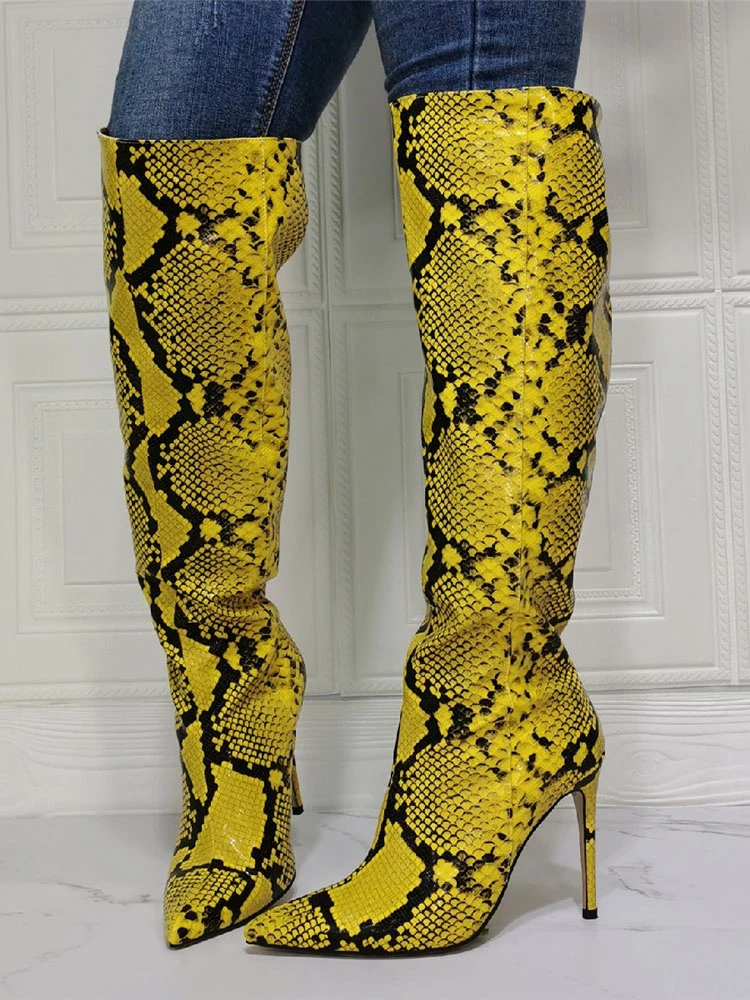 Women Knee High Boots Python Pointed Toe Stiletto Heel Sexy Heel Boots