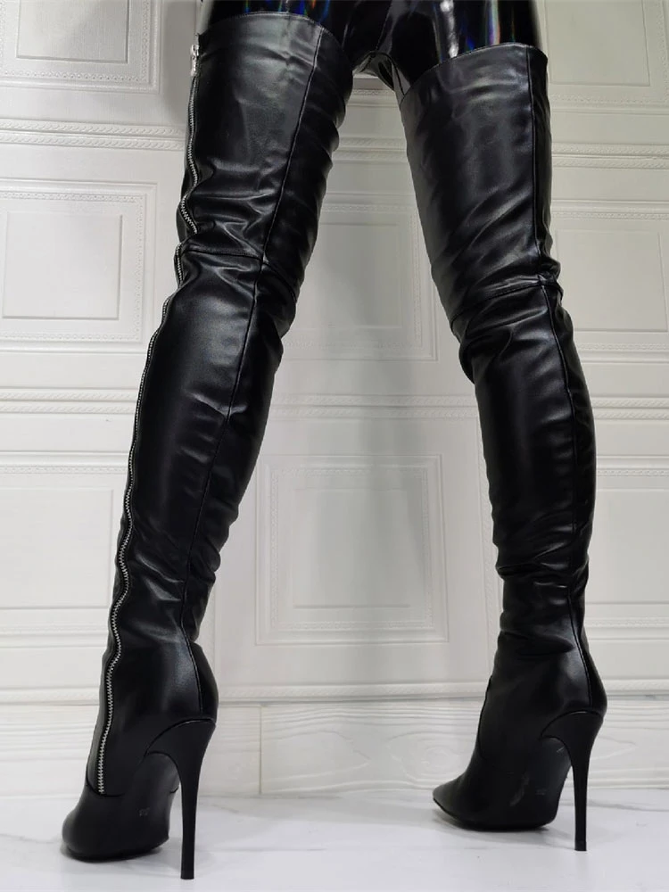 Women Over The Knee Boot Plus Size Stiletto Heel PU Leather Black Thigh High Boots
