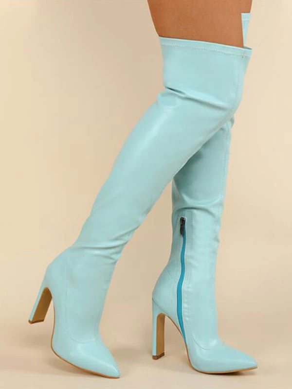 Women Over The Knee Boots Chunky Heel Pointed Toe PU Leather Blond Thigh High Boots