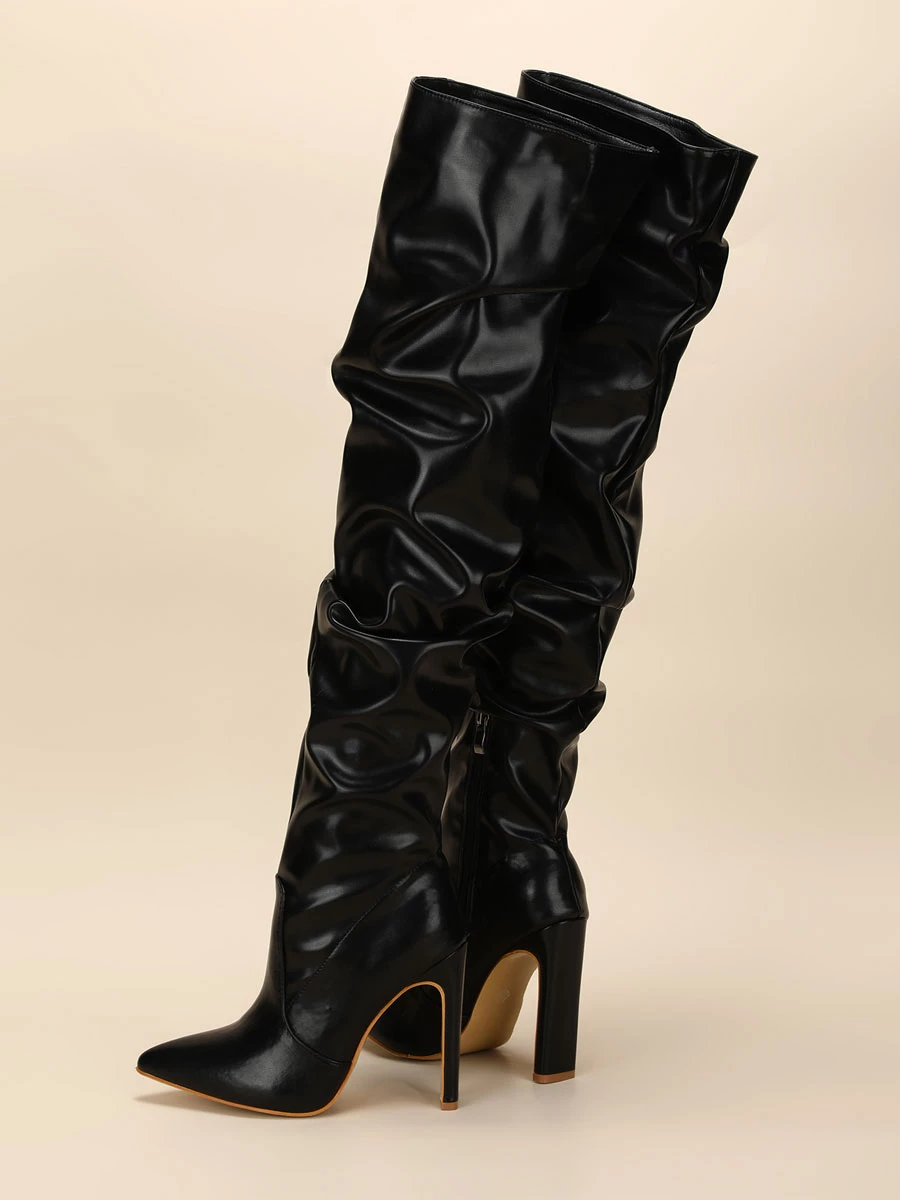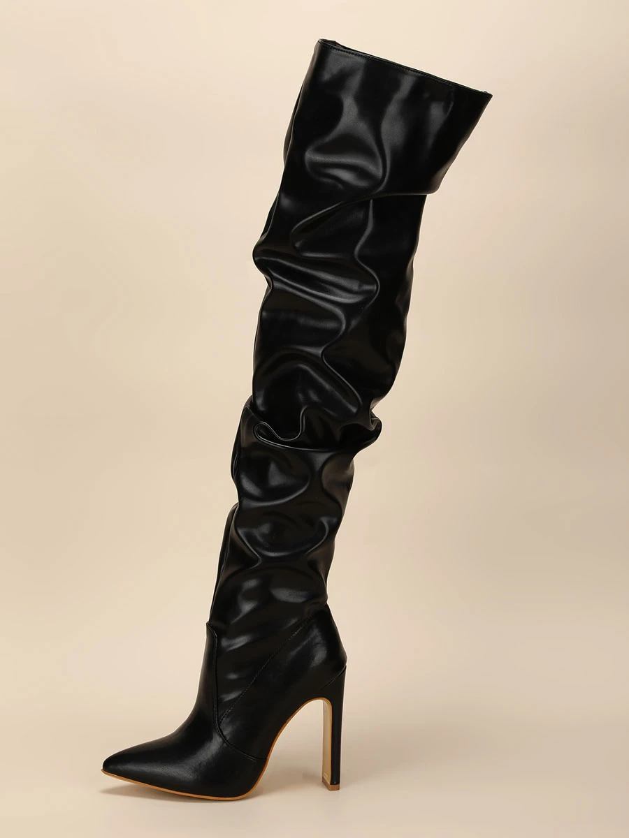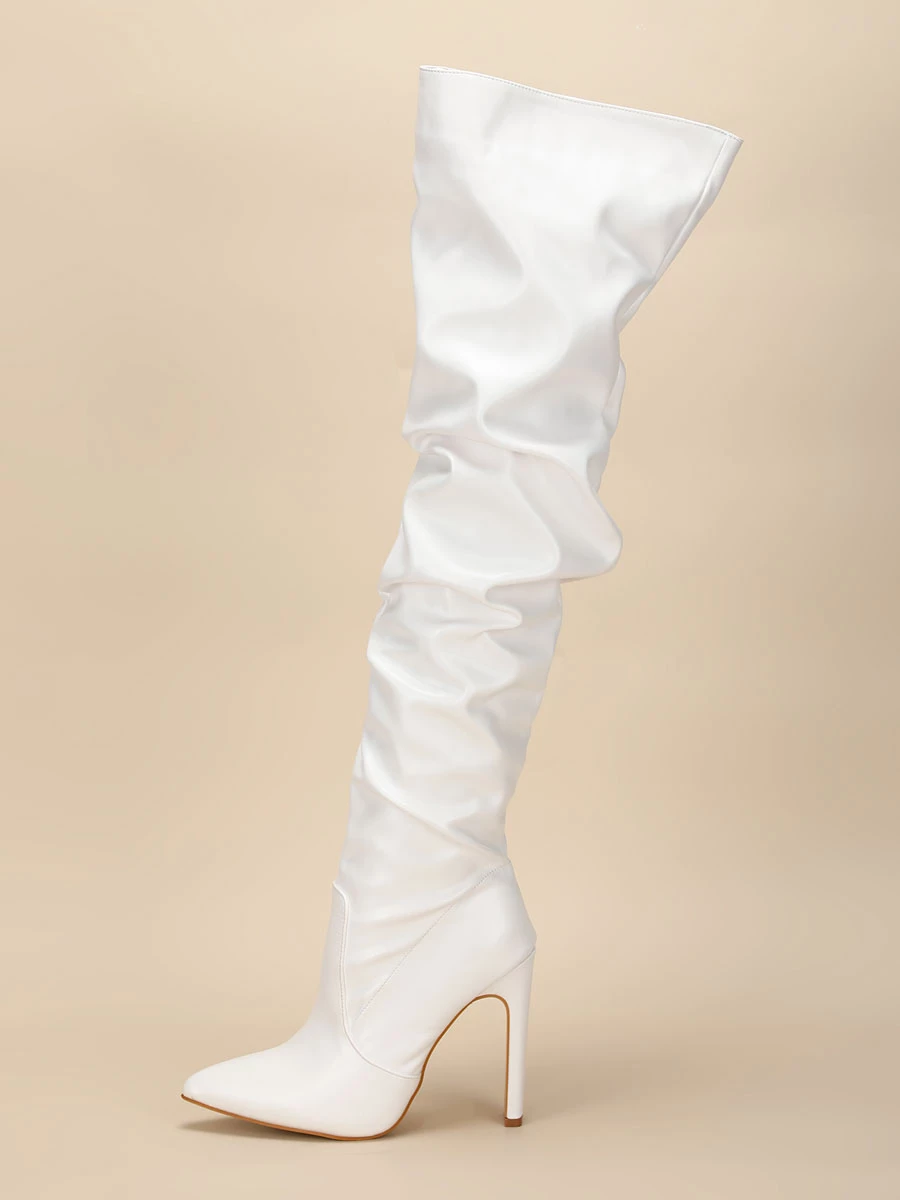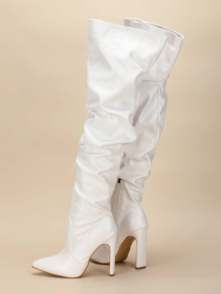 Women Over The Knee Boots Chunky Heel Pointed Toe PU Leather White Thigh High Boots