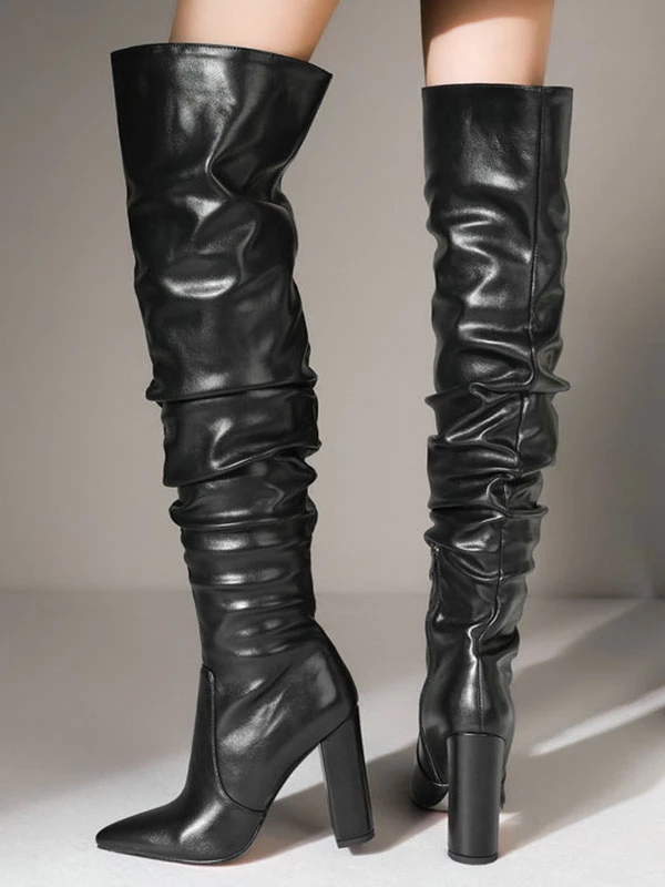 Women Over The Knee Boots Chunky Heel PU Leather Black Thigh High Boots