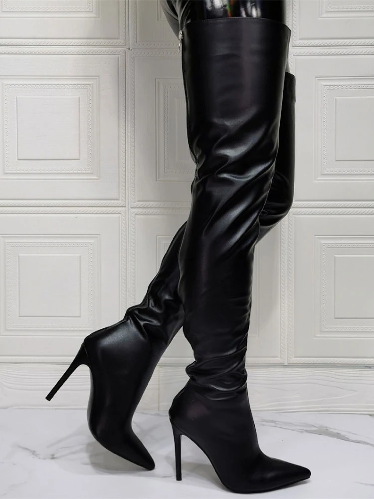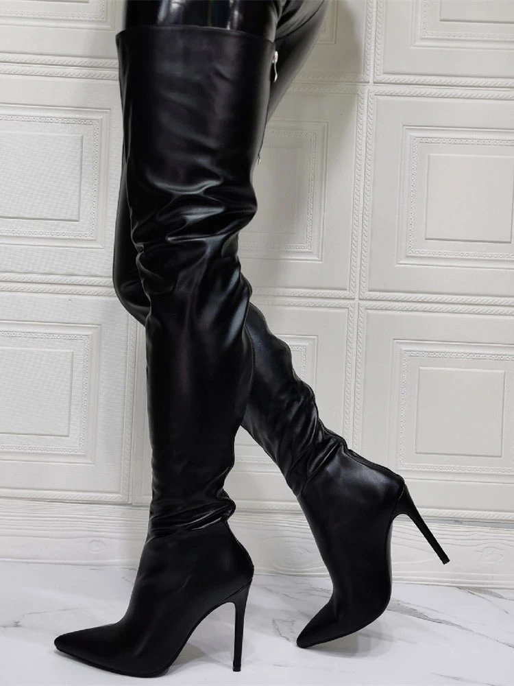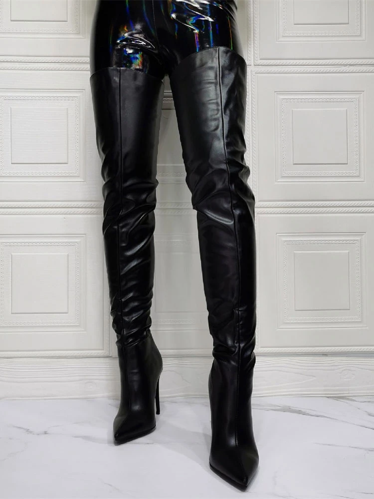 Women Over The Knee Boots Plus Size Stiletto Heel PU Leather Black Thigh High Boots