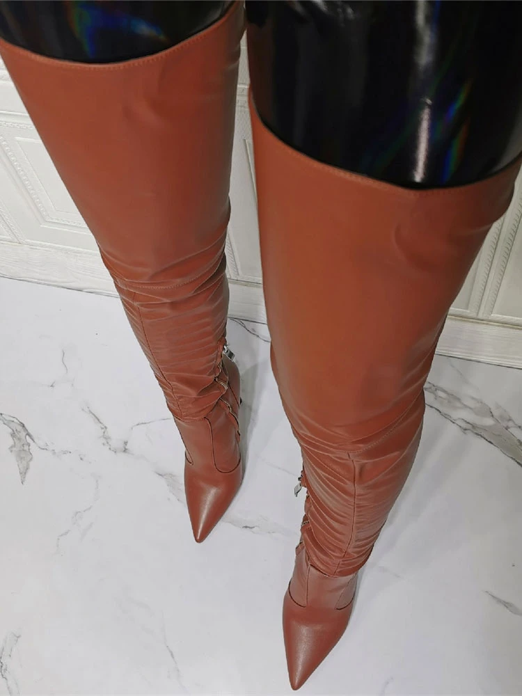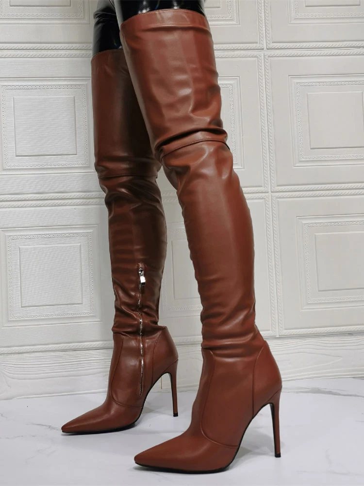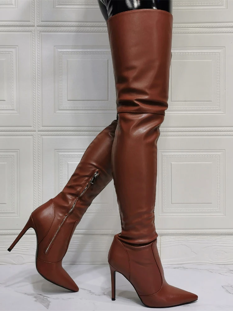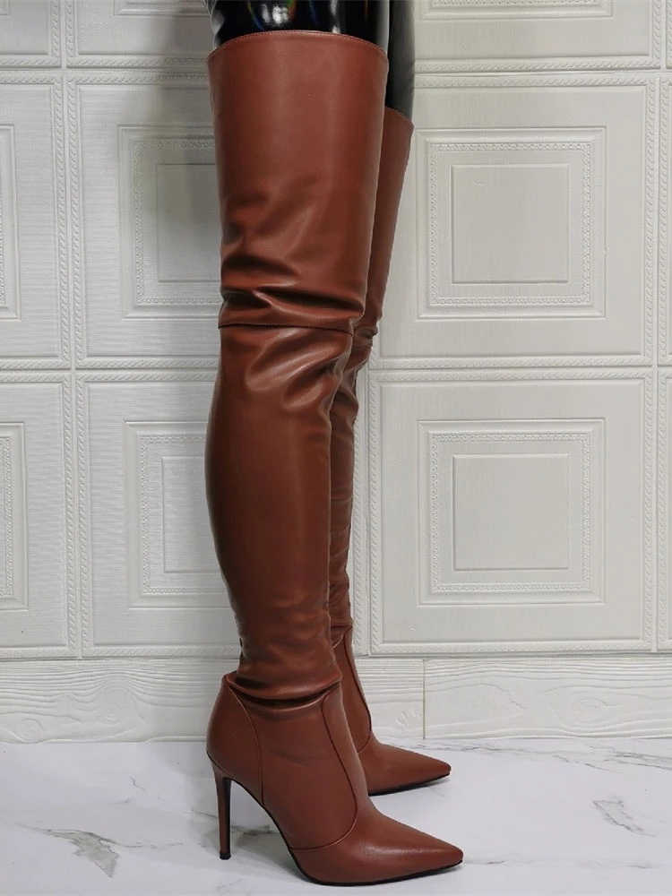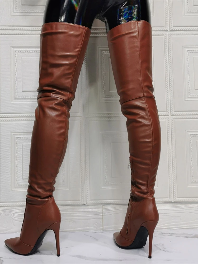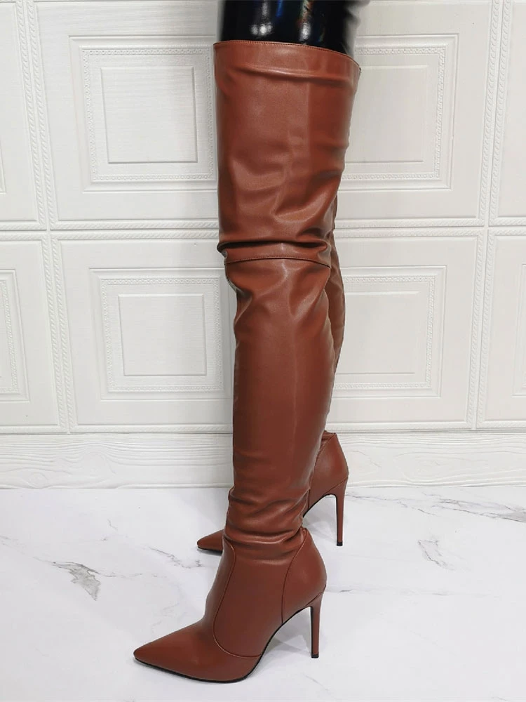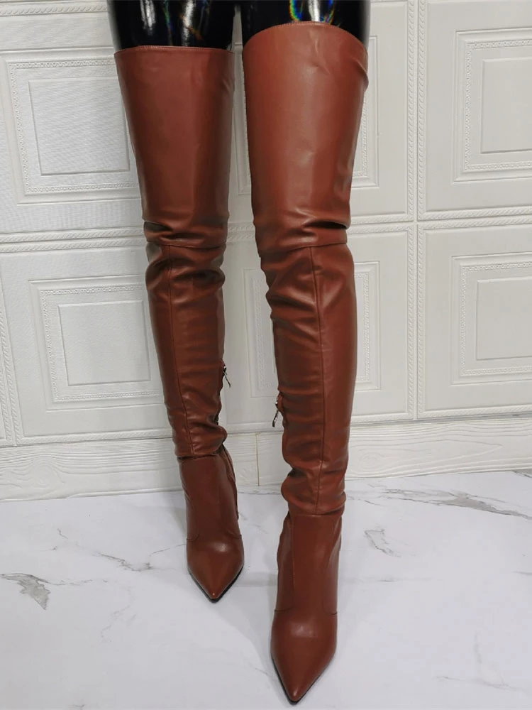 Women Over The Knee Boots Plus Size Stiletto Heel PU Leather Coffee Brown Thigh High Boots