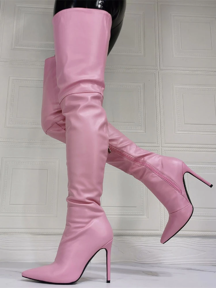 Women Over The Knee Boots Plus Size Stiletto Heel PU Leather Light Pink Thigh High Boots