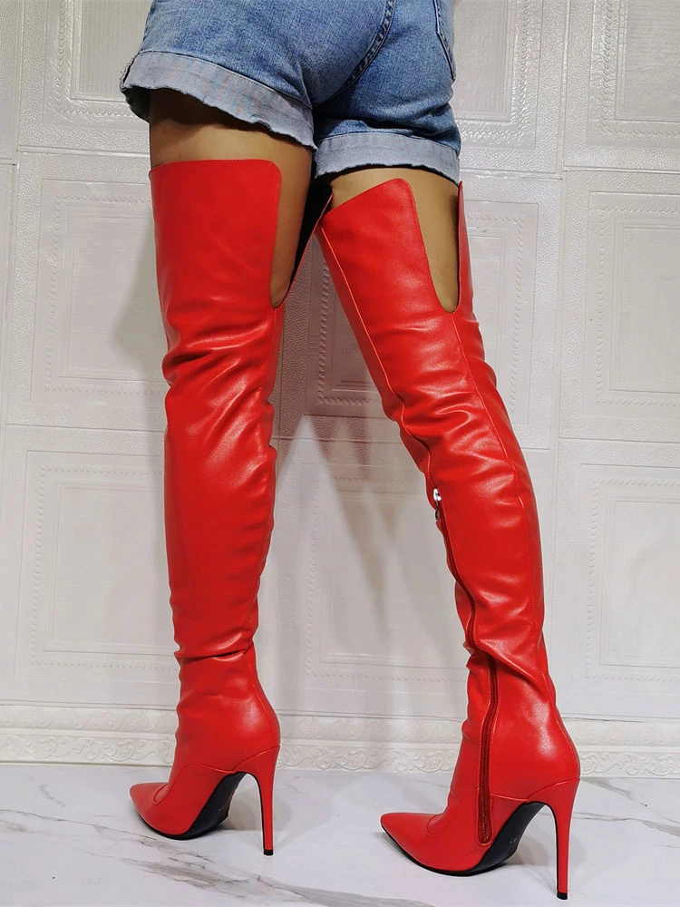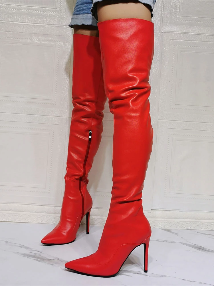 Women Over The Knee Boots Plus Size Stiletto Heel PU Leather Red Thigh High Boot
