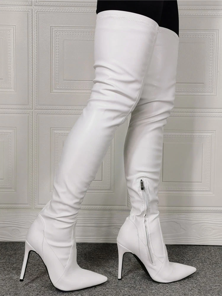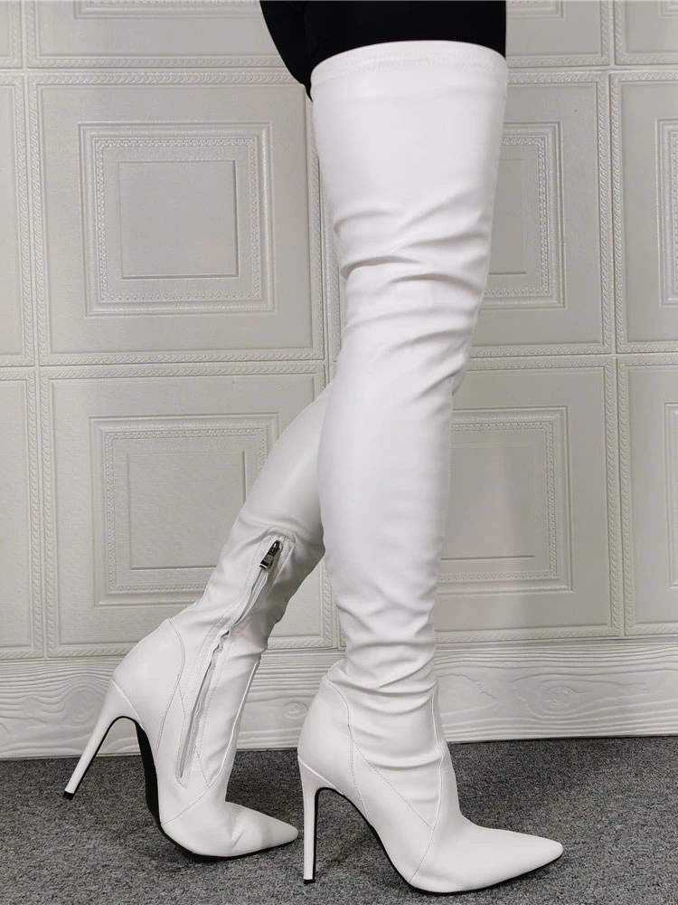 Women Over The Knee Boots Plus Size Stiletto Heel PU Leather White Thigh High Boots