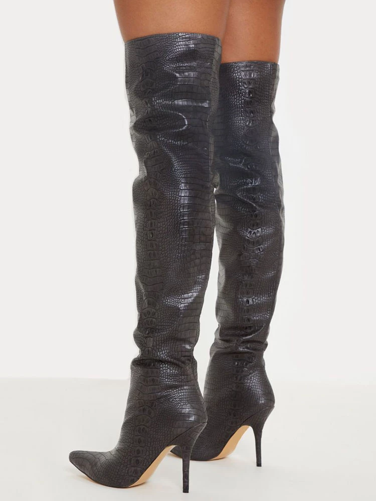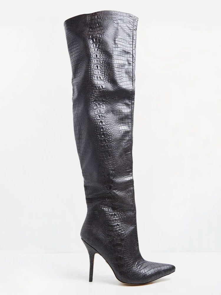 Women’s Alligator Embossed Thigh High Heel Boots Black