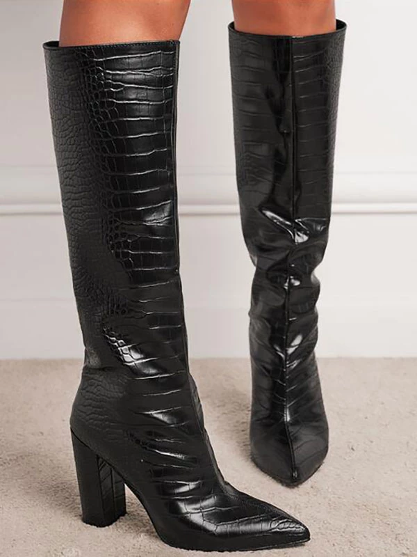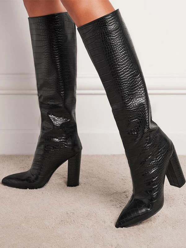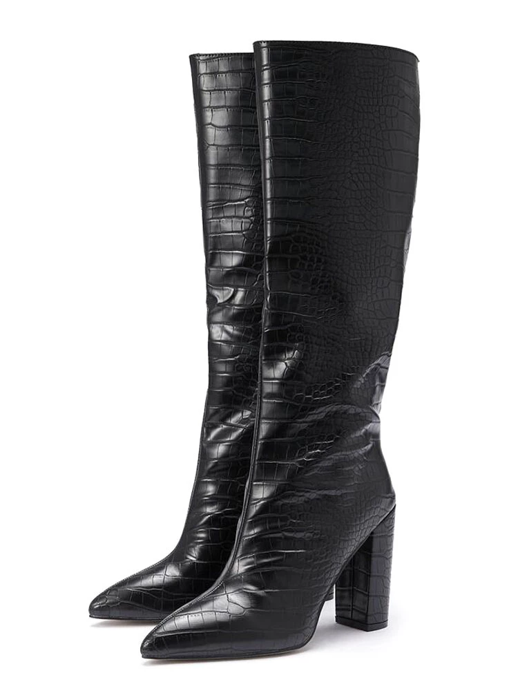 Women’s Crocdile Print Chunky Heel Knee High Boots In Black