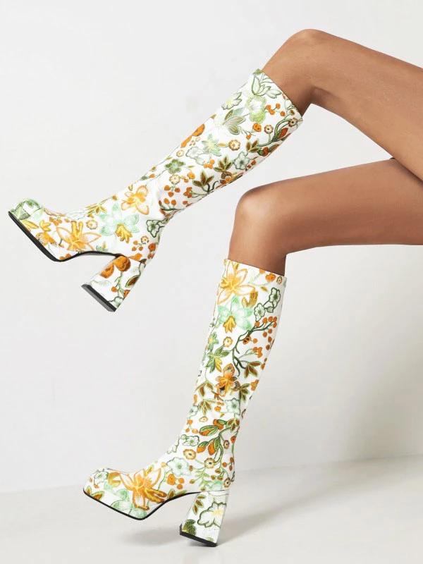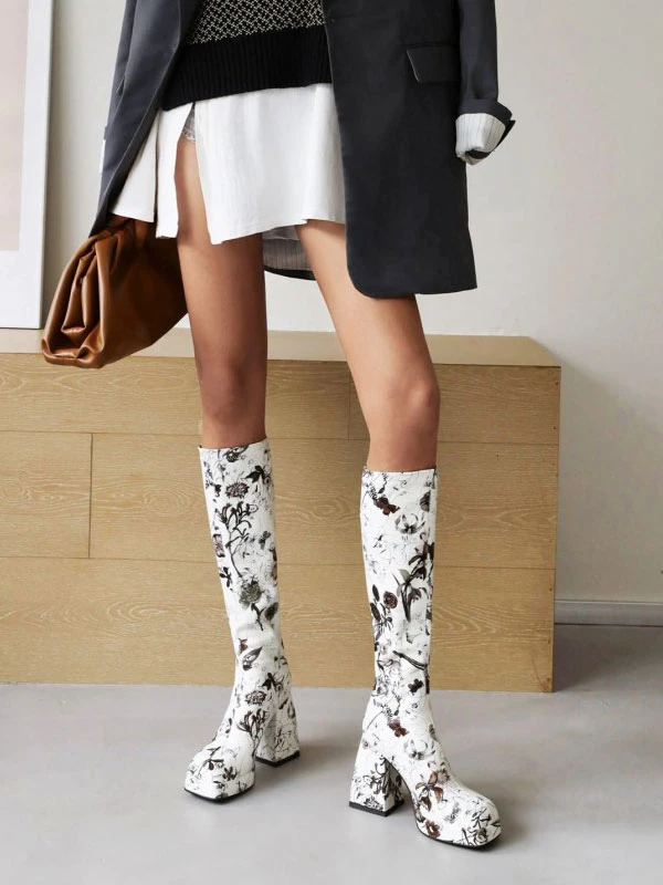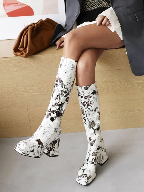 Women’s Flower Print Block Heel Platform Knee High Boots