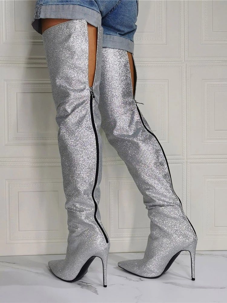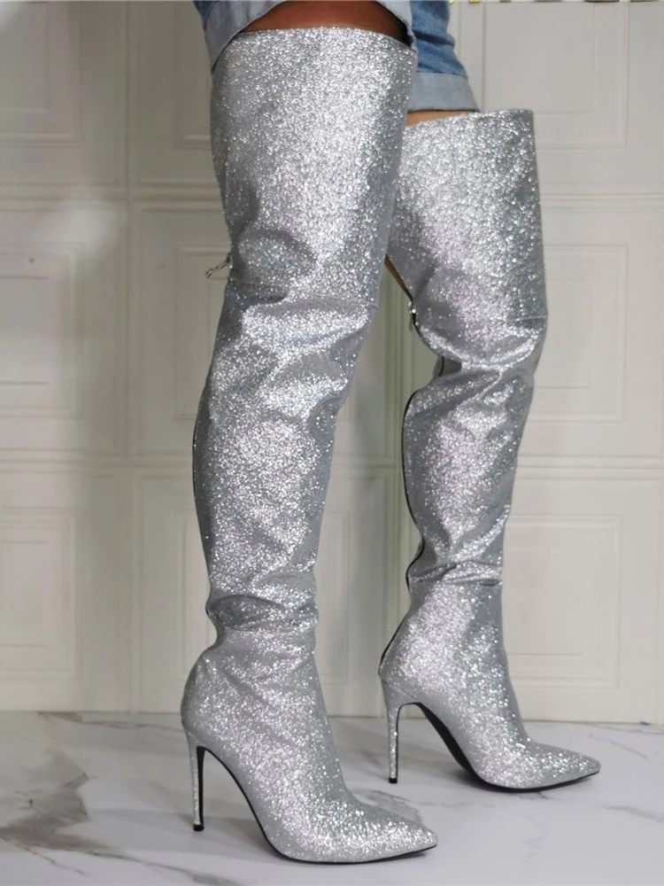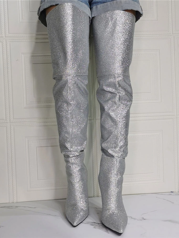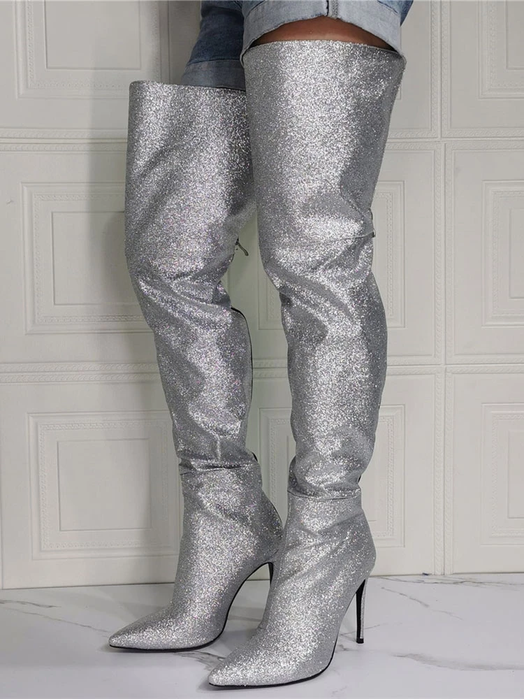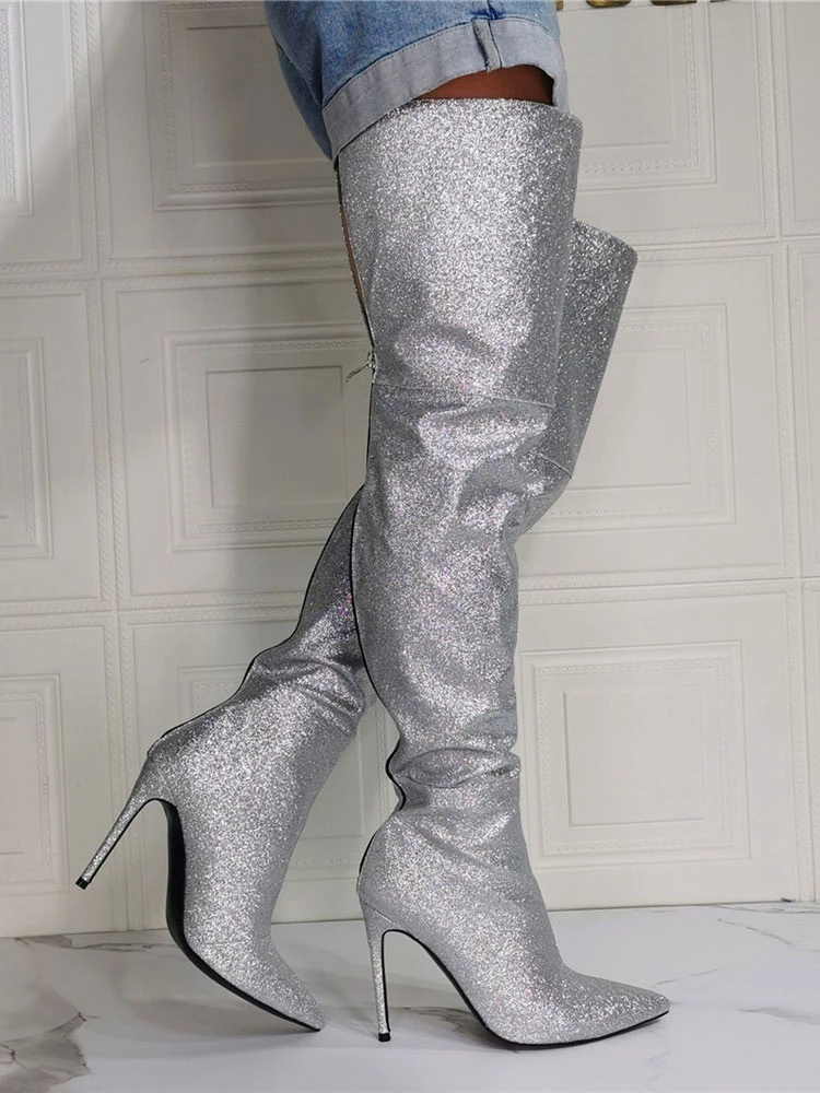 Be the first to review “Women’s Glitter Thigh High Heel Boots In Silver” Cancel reply