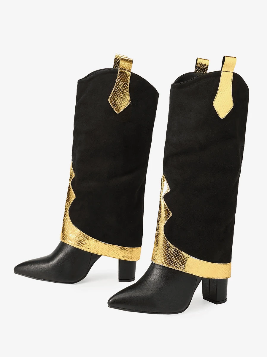 Women’s Knee High Boots Black Suede Pointed Toe Chunky Heel Knee Length Boots