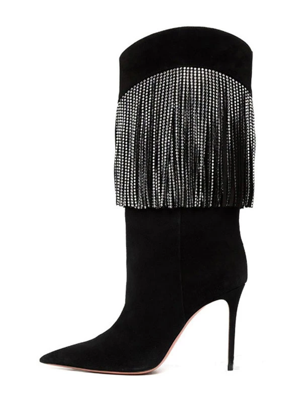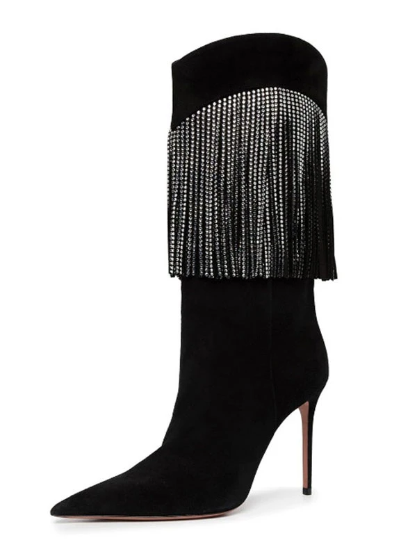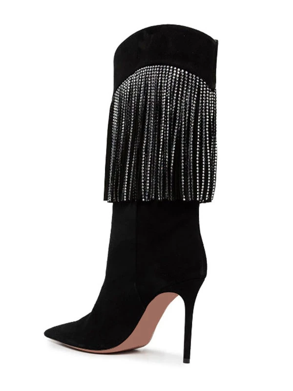Women’s Knee High Boots Black Suede Rhinestones Pointed Toe Stiletto Heel Boots