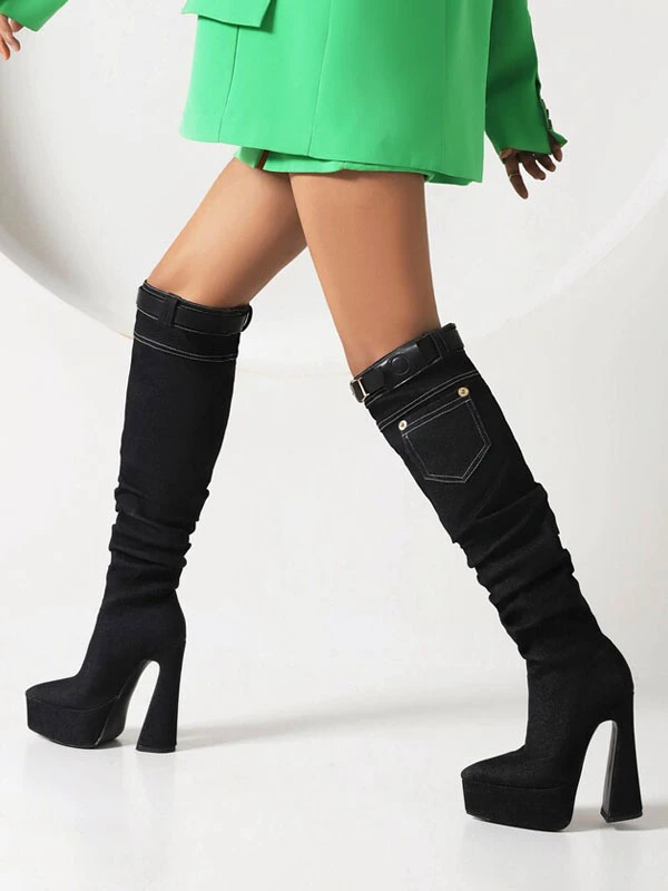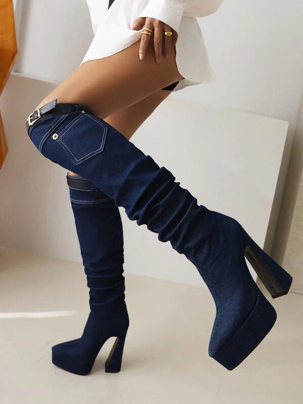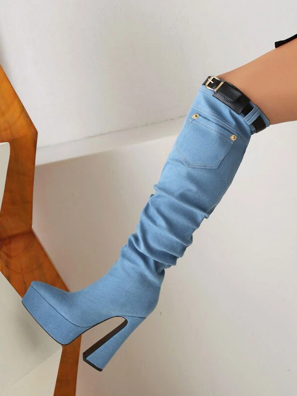 Women’s Knee High Boots Denim Platform Buckle Detail Chunky Heel Boots