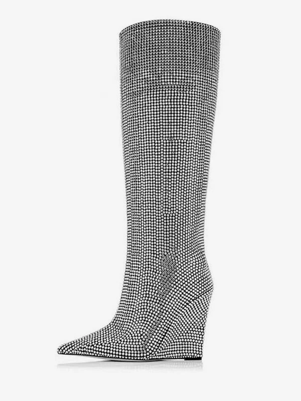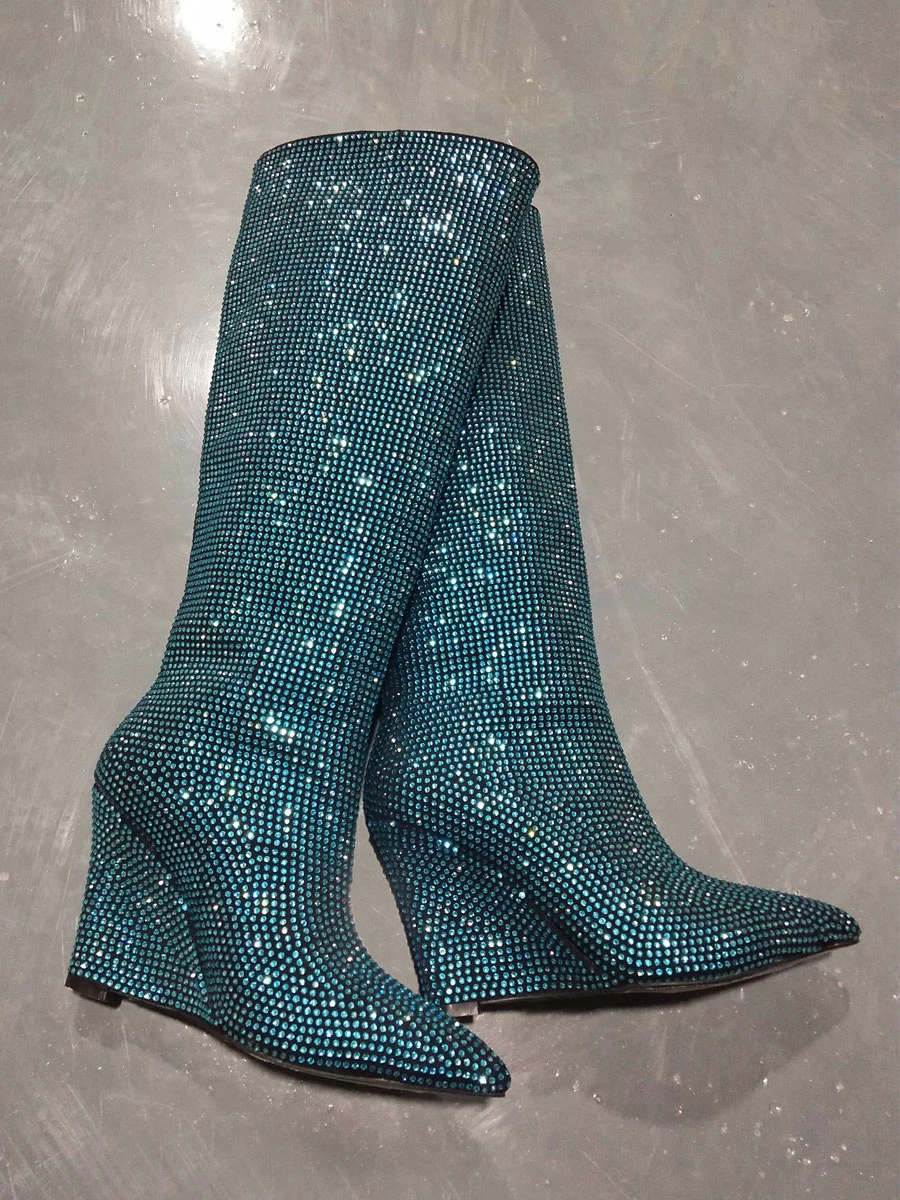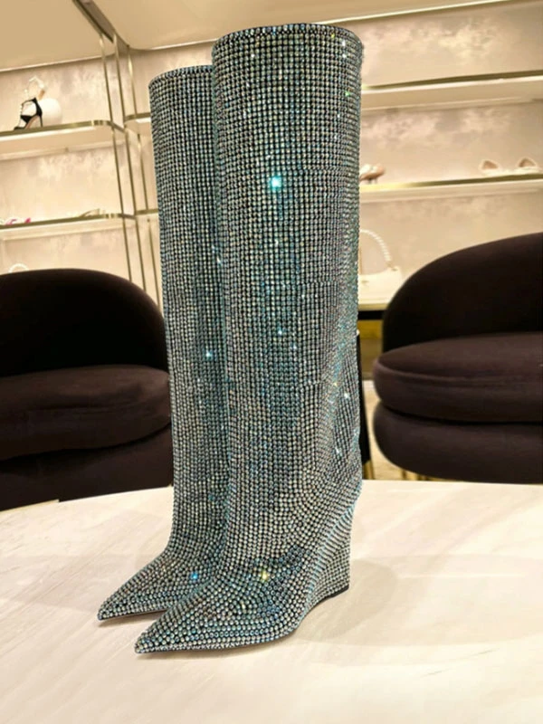 Women’s Knee High Boots Rhinestones Pointed Toe Wedge Heel Party Boots