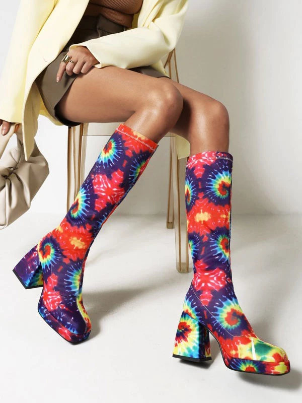 Women’s Printed Platform Block Heel Knee-High Boots Square Toe