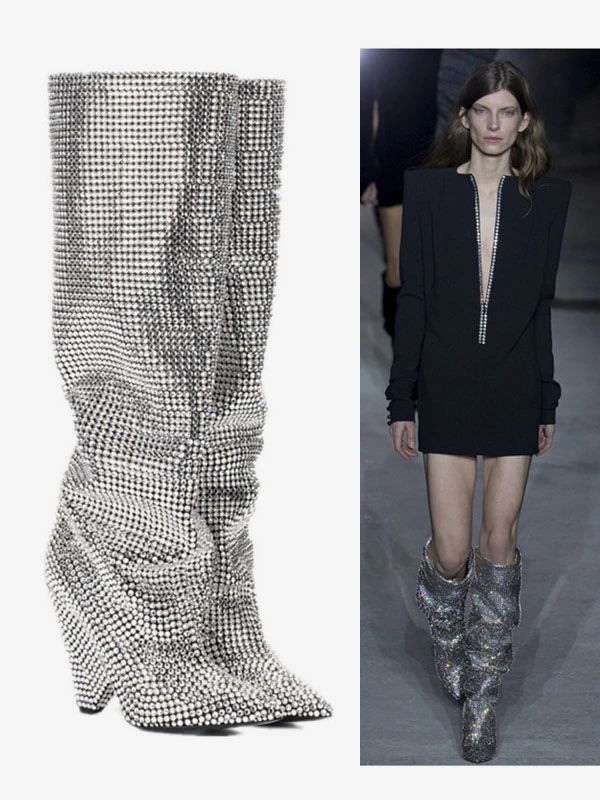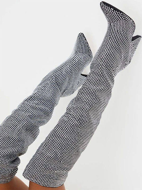 Women’s Slouch Boots Elegant Rhinestones Cone Heel Knee High Boots