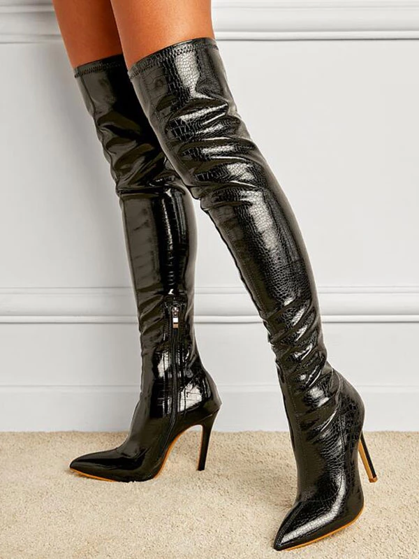 Women’s Thigh High Boots Pointy Toe Stiletto Heel Bright Leather