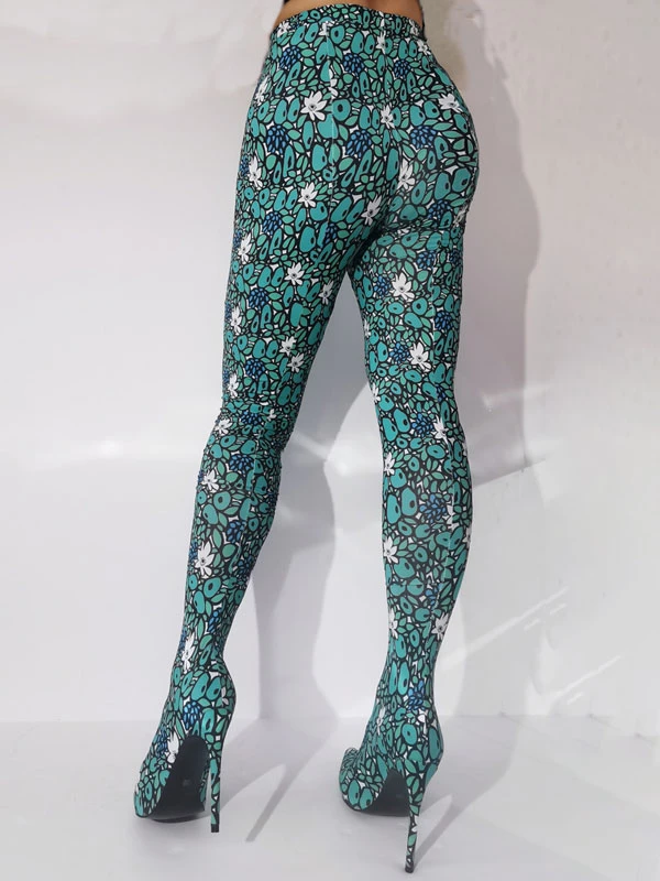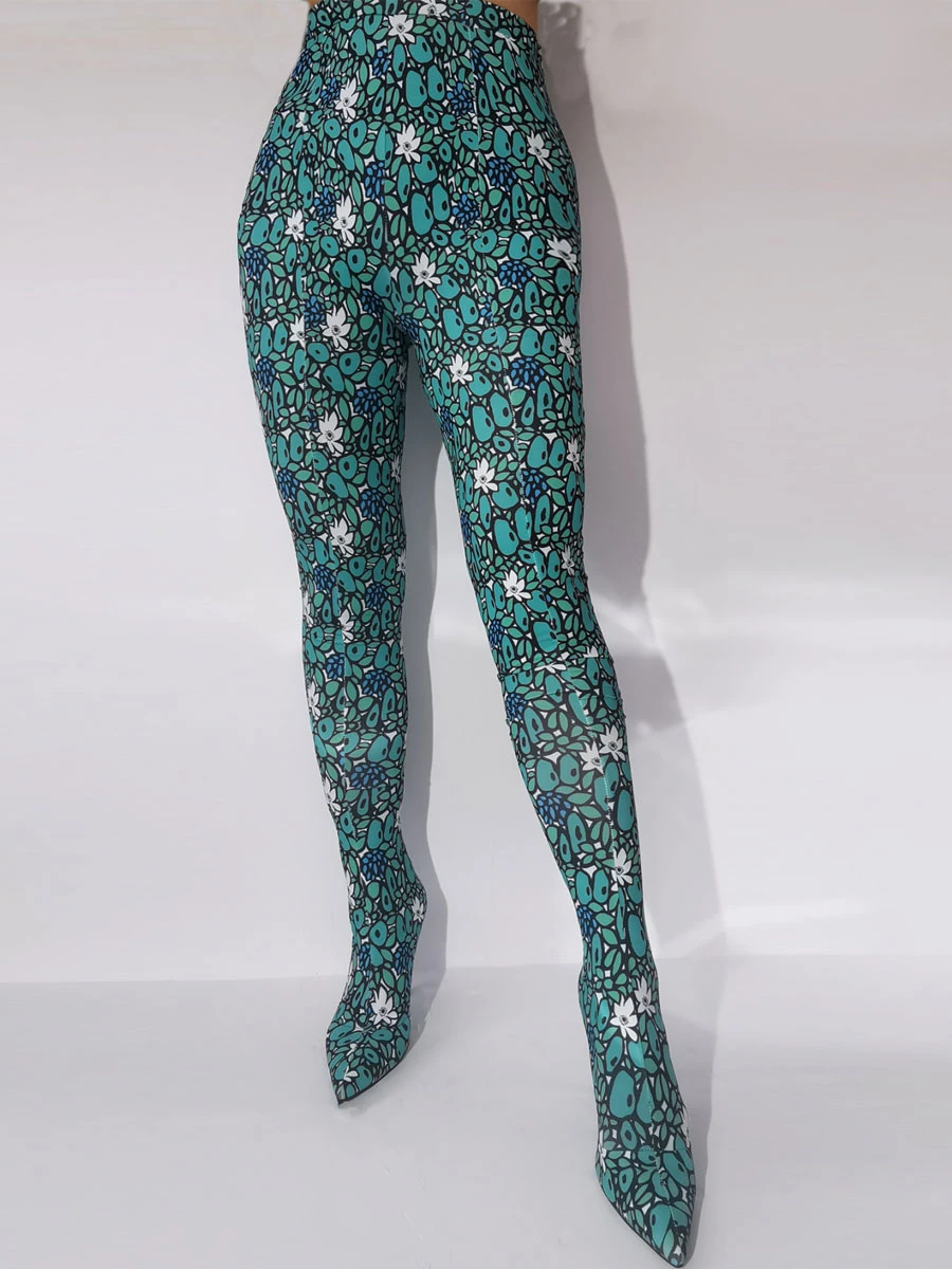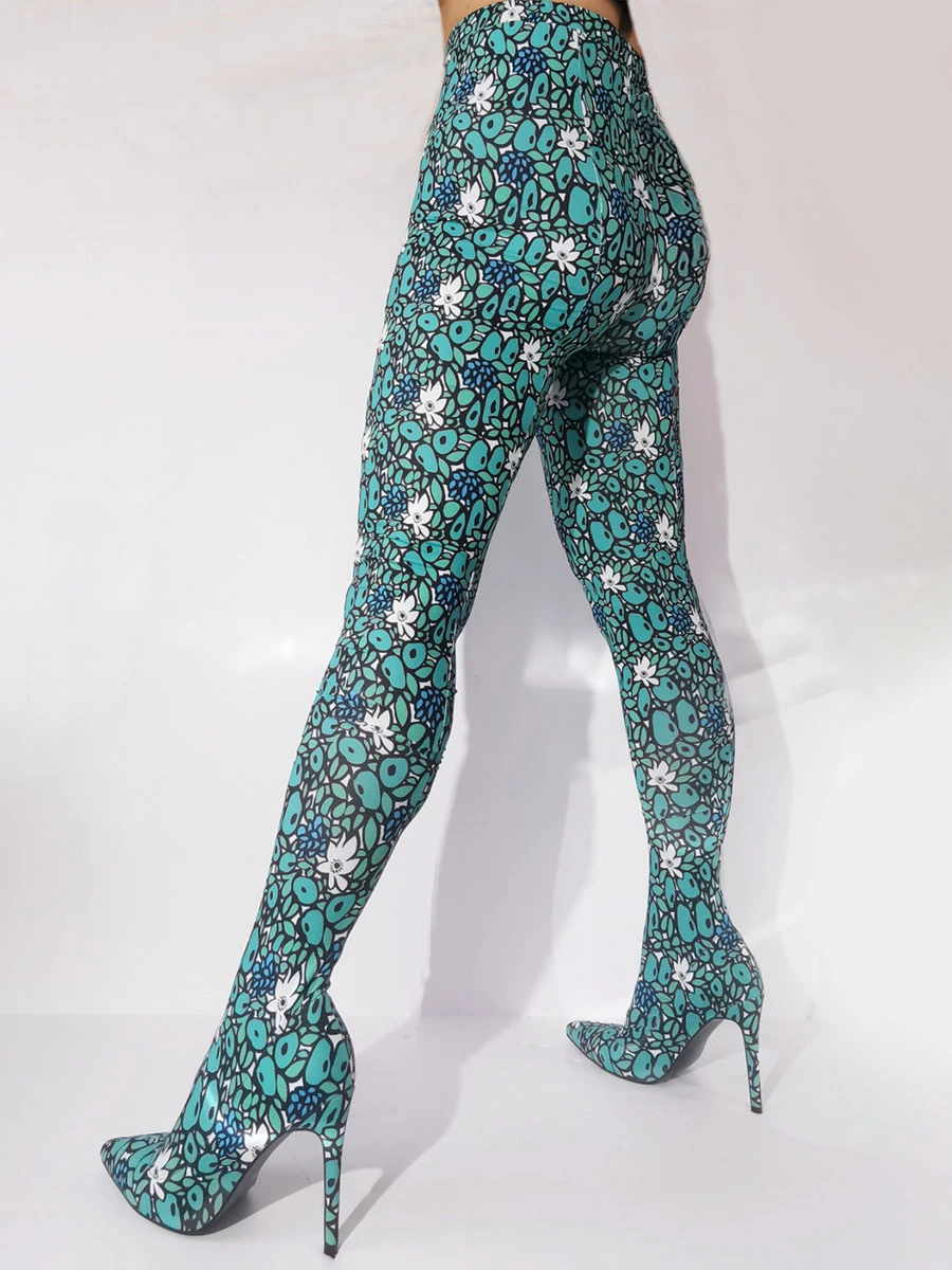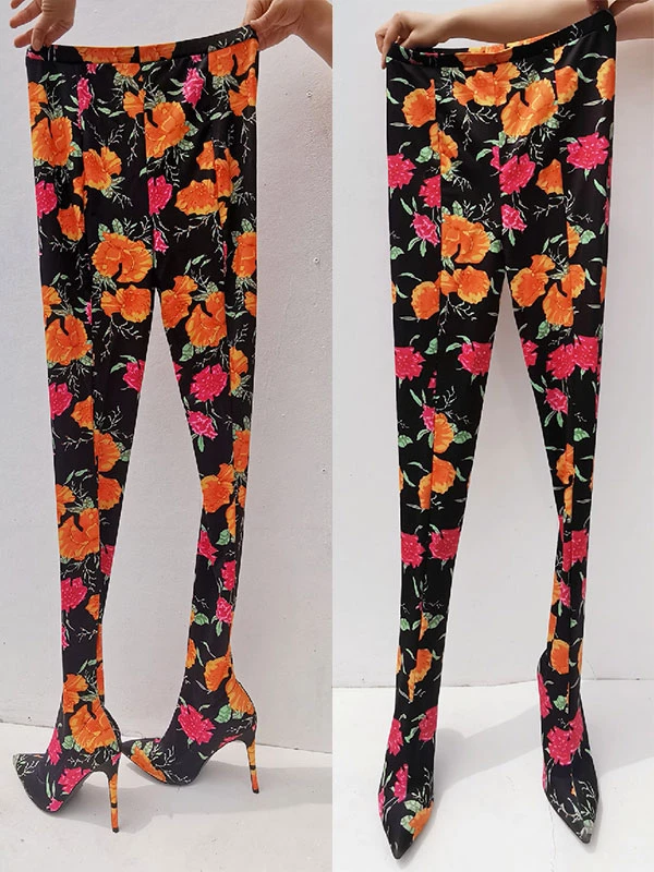 Women’s Tigh High Boots Pointed Toe Floral Printed Stiletto Heel Elastic Pant Shoes
