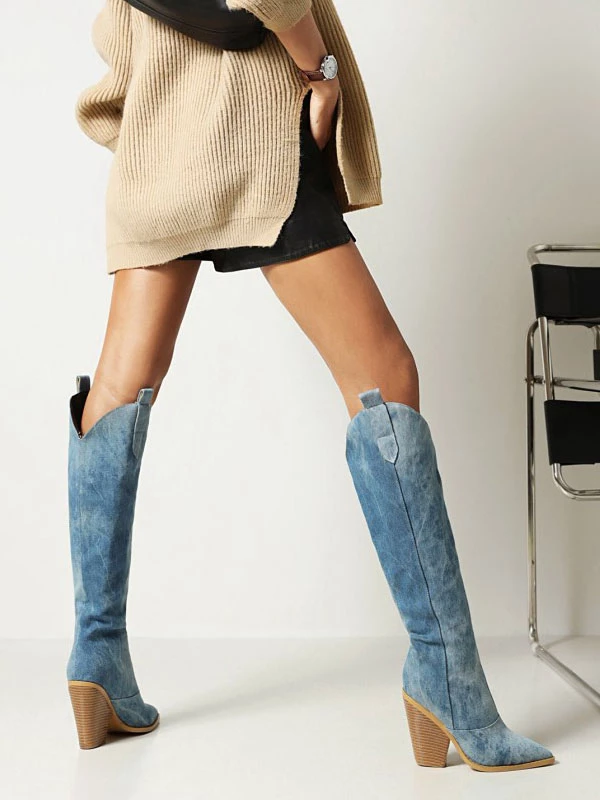 Women ‘s Western Boots Canvas Chunky Heel Knee-High Boots
