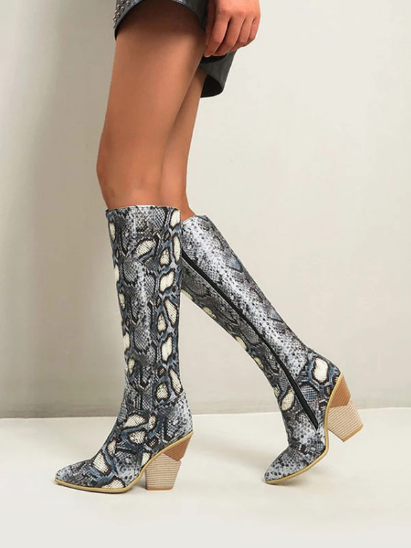Women’s Western Boots Snakeskin Knee-High Boots Block Heel Pink Cowgirl Boots