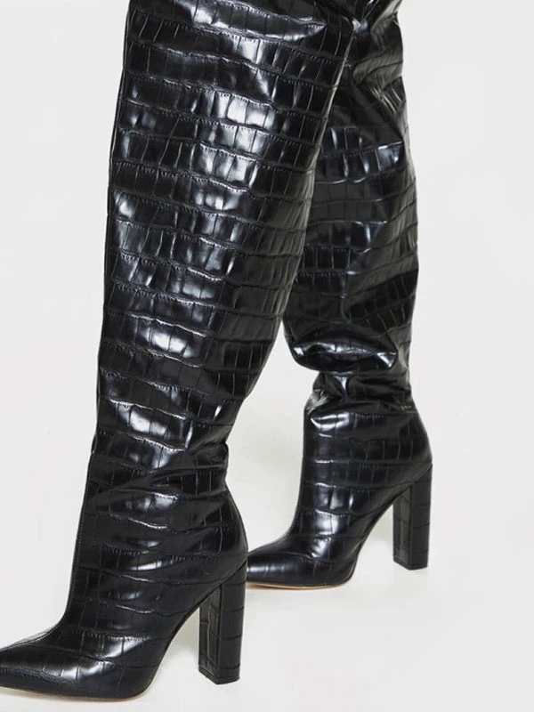 Women’s Wide Stone Grain Chunky Heel Bright Leather Thigh High Boots