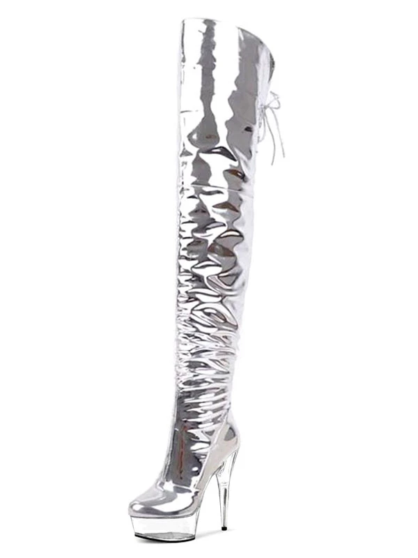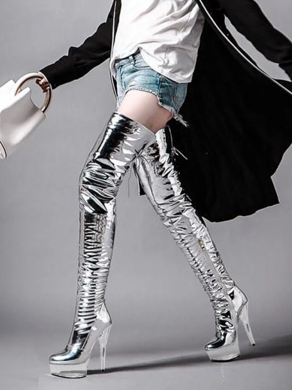 Women Sexy Boots Open Toe Zipper Sequins Stiletto Heel Rave Club Silver Thigh High Boots Over The Knee Boots