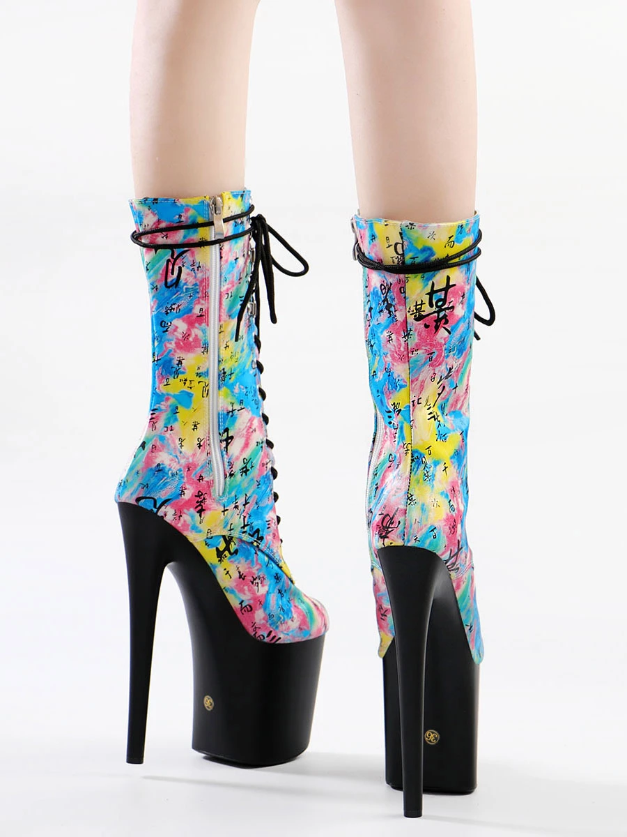 Women Sexy Boots Round Toe Lace Up Printed Stiletto Heel Rave Club Blue Thigh High Boots Over The Knee Boots